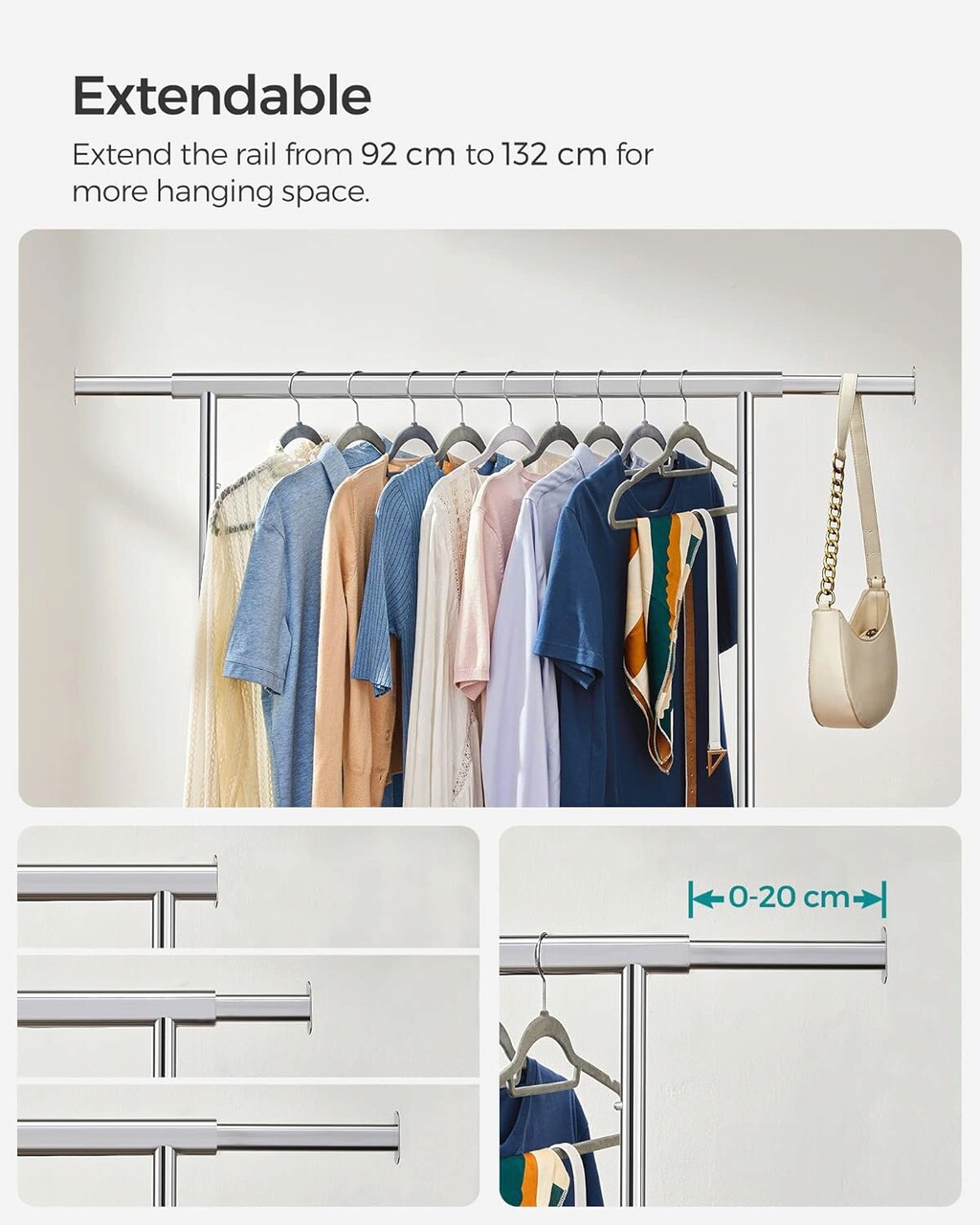 Sina de agatat extensibila Fiecare capat al barei superioare se extinde cu inca 20 cm pentru a va oferi mai mult spatiu de agatat (sina superioara se extinde de la 92 cm la 132 cm); cele 2 capete de extensie sunt, de asemenea, ideale pentru a va agata gentile de mana, palariile, esarfele sau alte accesorii.