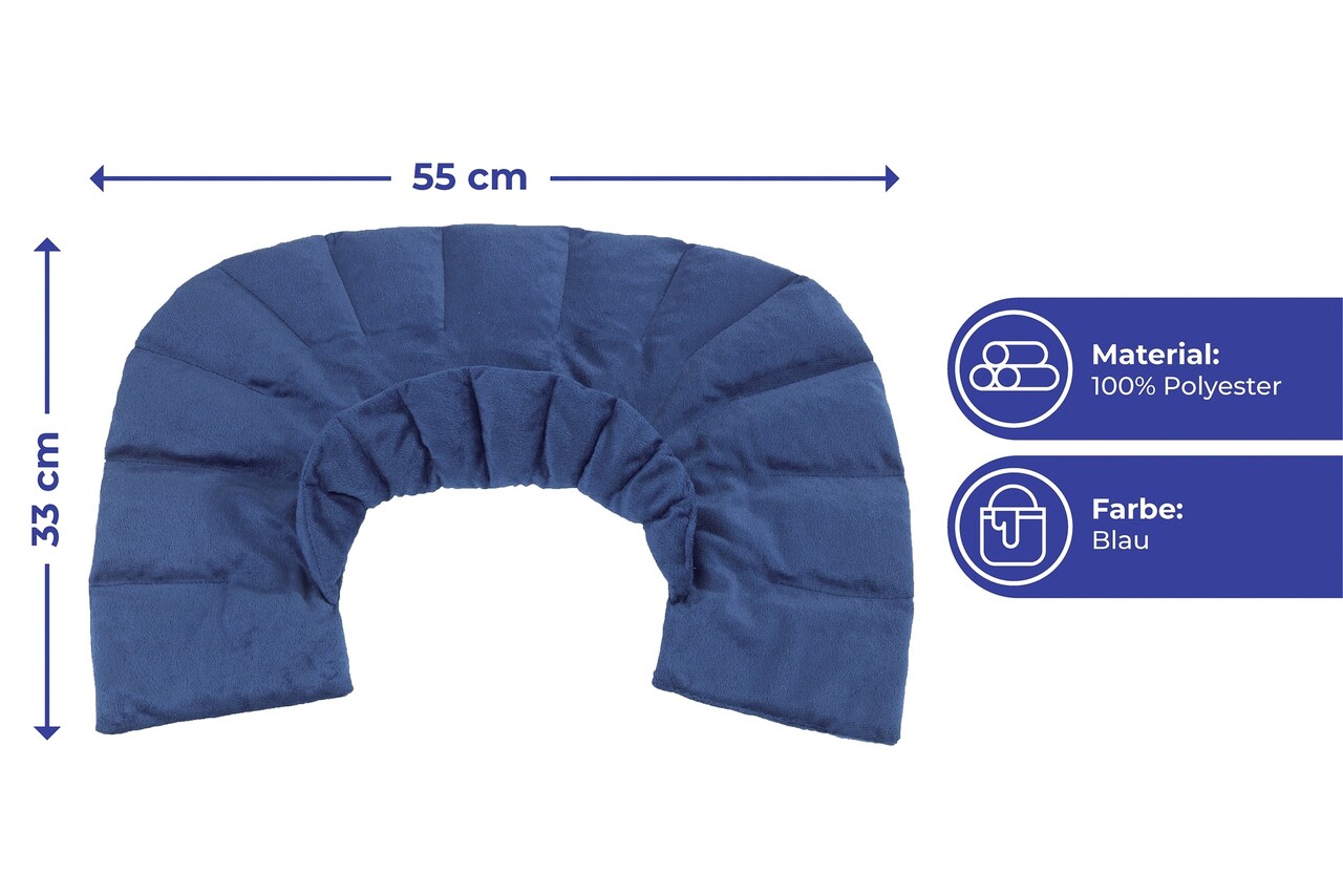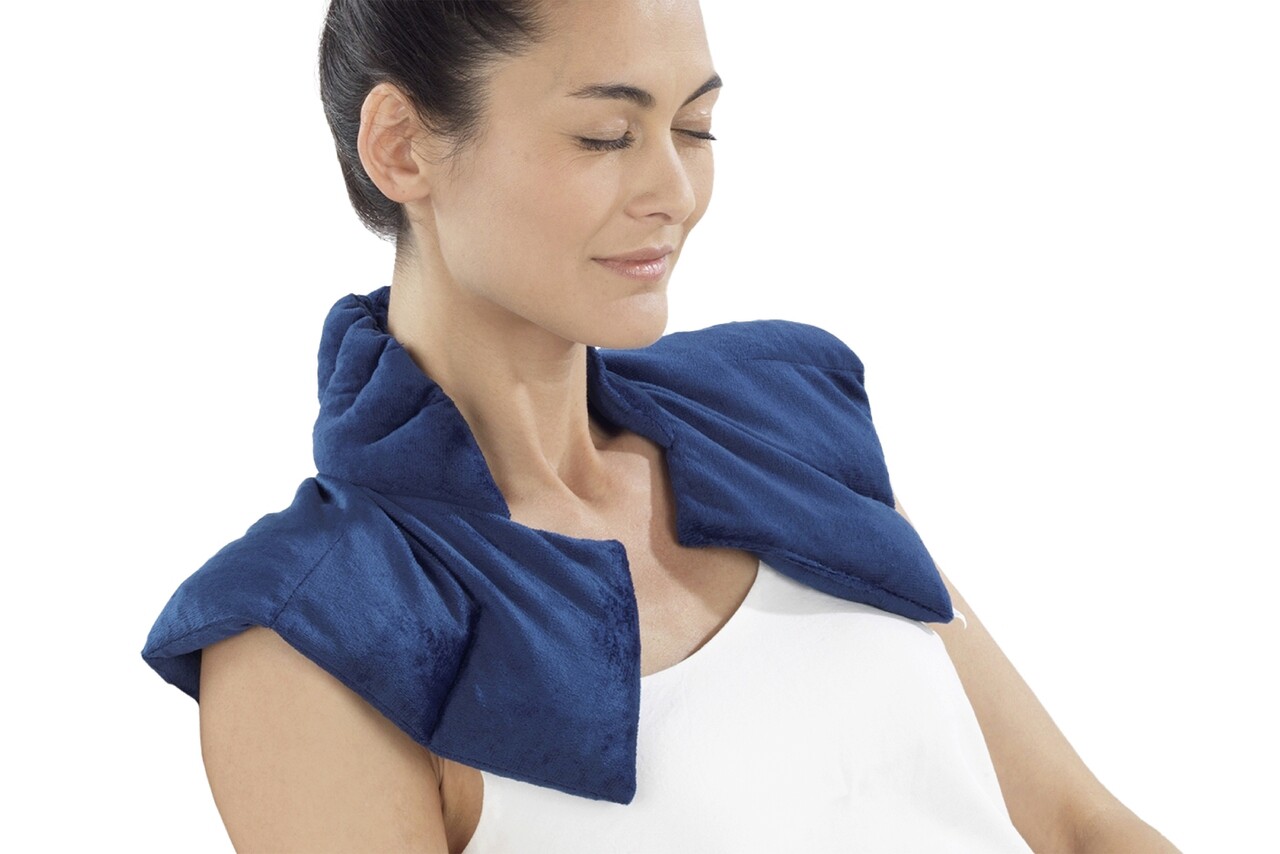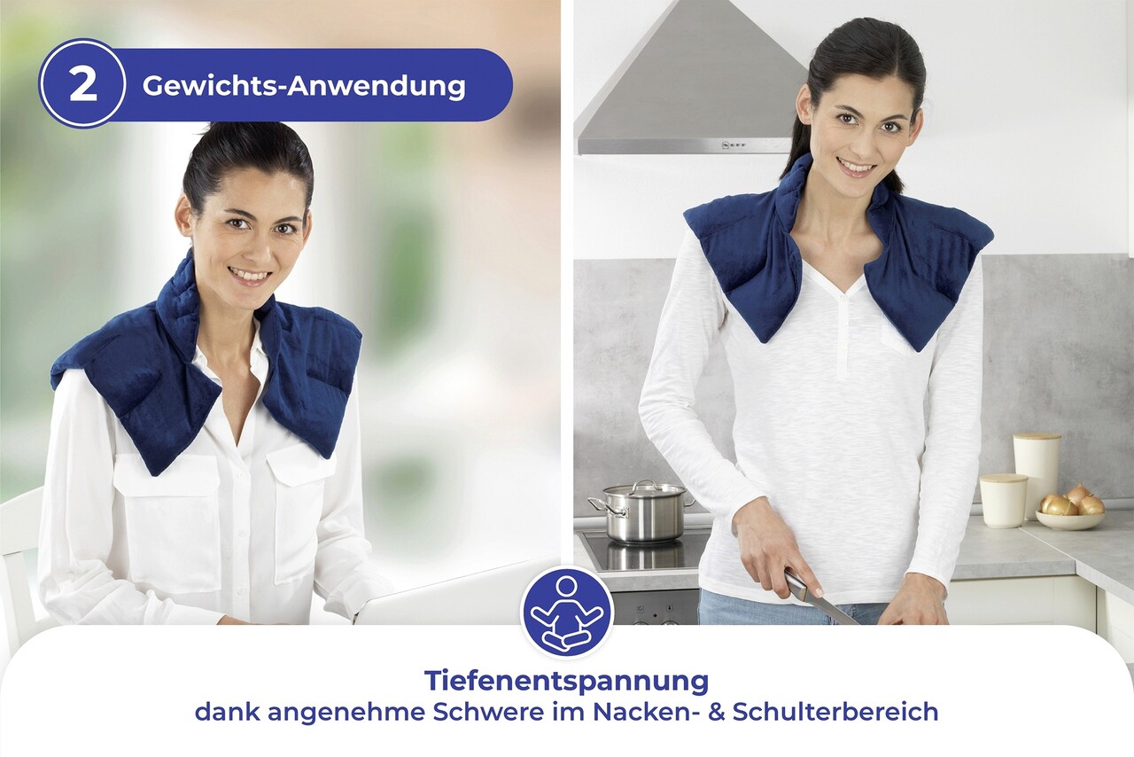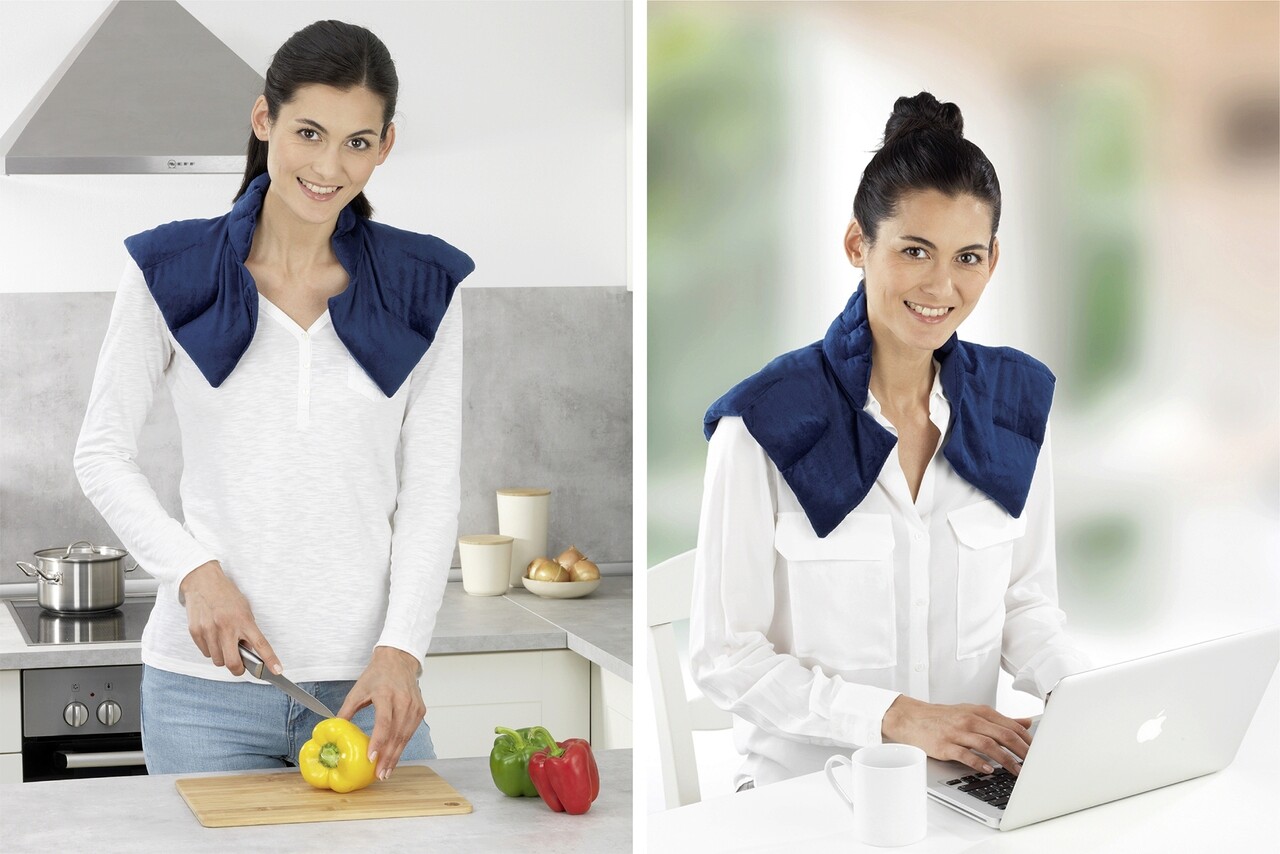 Aplicarea rece/cald este o masura dovedita pentru muschii stresati, suprasolicitare si incordare unilaterala. Pur si simplu puneti suportul in cuptorul cu microunde sau in congelator. Odata cu aplicarea greutatii, o greutate placuta se instaleaza in zona umerilor si gatului si asigura o relaxare profunda placuta. Cand suportul este incalzit se elibereaza un parfum subtil de lavanda care echilibreaza simturile si limpezeste mintea.