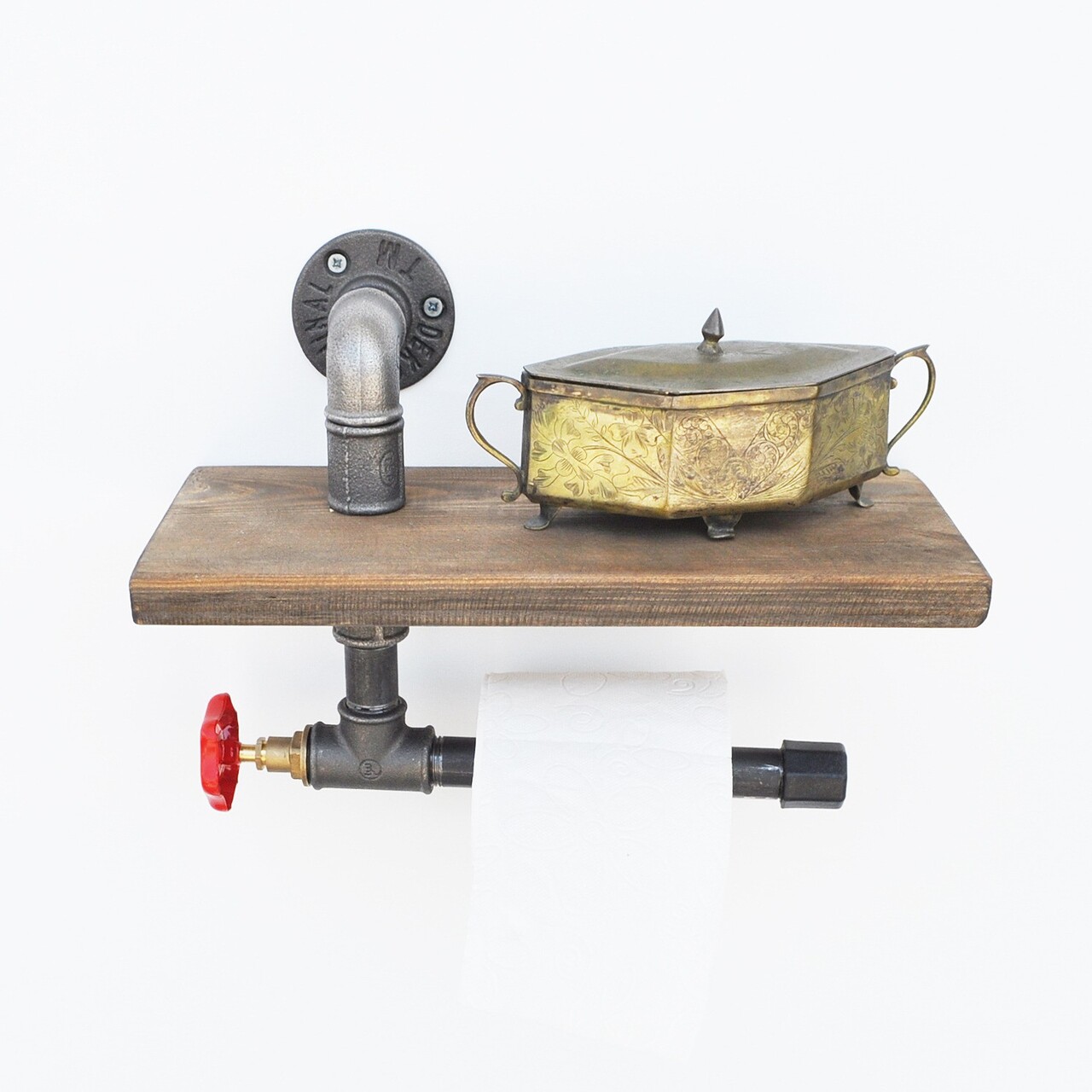 Suport pentru hartie igienica si accesorii, Evila Originals, Boruraf175, 31 x 22 x 14 cm, lemn de molid/metal, nuc/negru