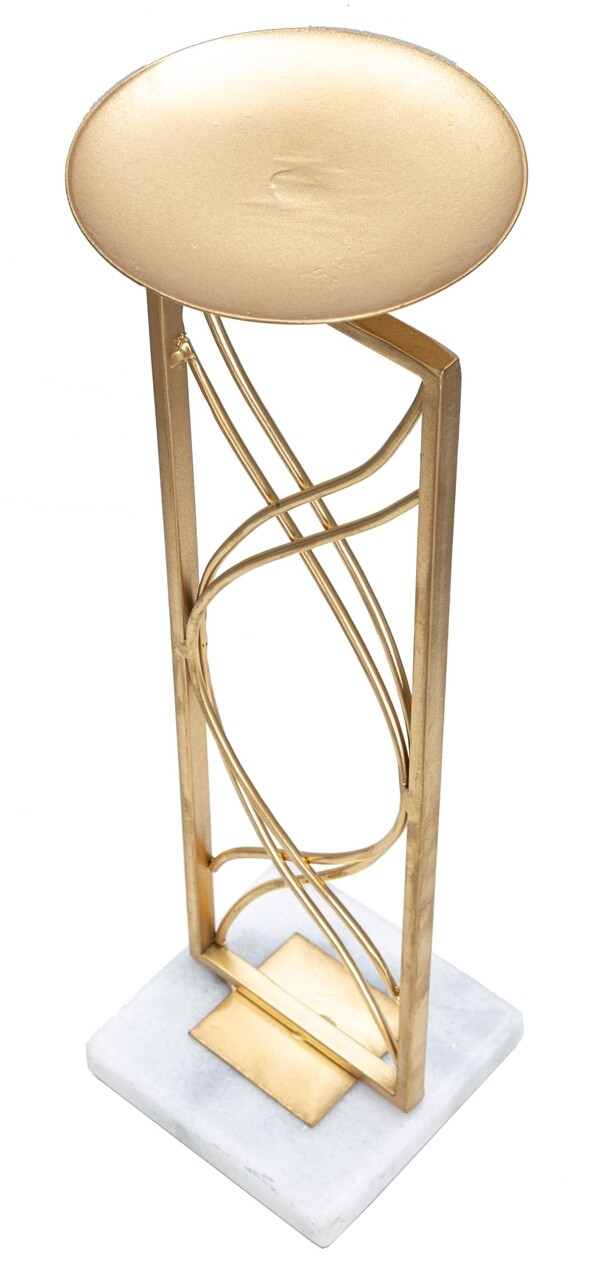 Suport pentru lumanare din metal auriu si baza de marmura alba, cu design liniar si geometric.