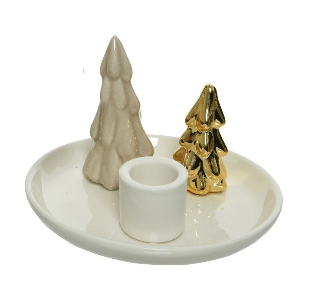 Suport pentru lumanare Trees, Decoris, 13x8.5 cm, portelan, alb/bej/auriu
