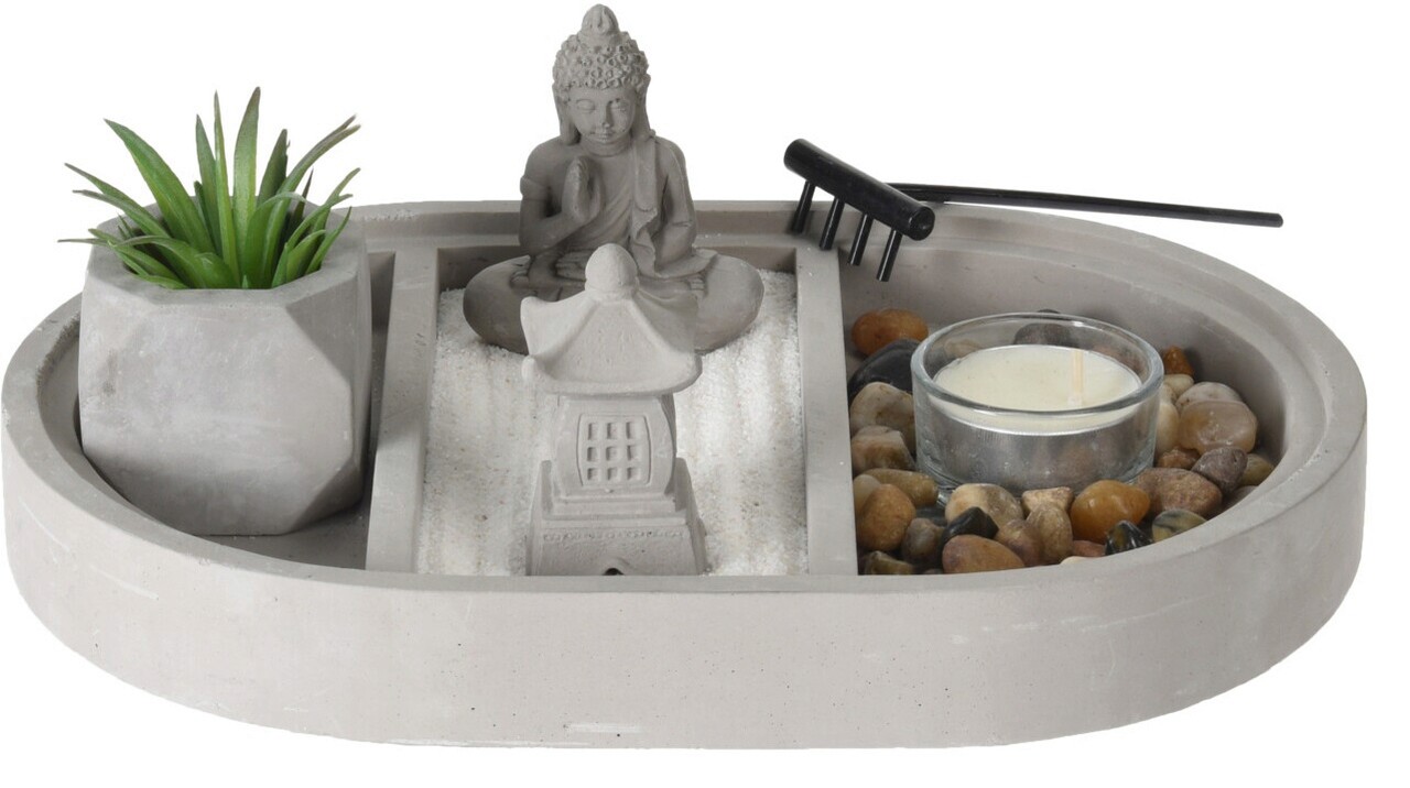 Suport pentru lumanari Buddha zen garden oval, 25x17x9 cm, ciment, gri
