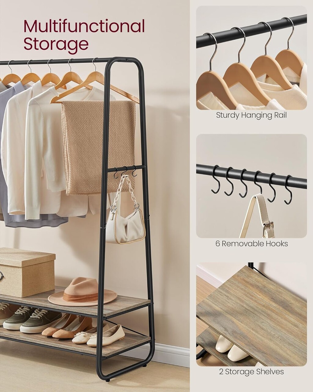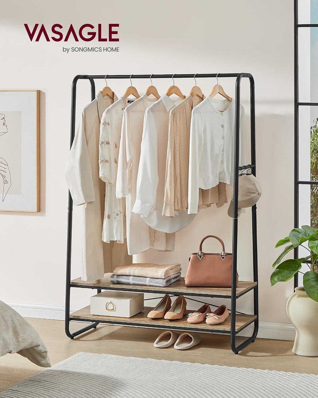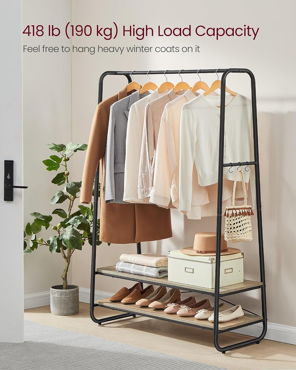 Suport pentru umerase cu 2 rafturi si 6 agatatori, Vasagle Turquoise, 100x45x160 cm, max. 190 kg, PAL/otel, negru mat