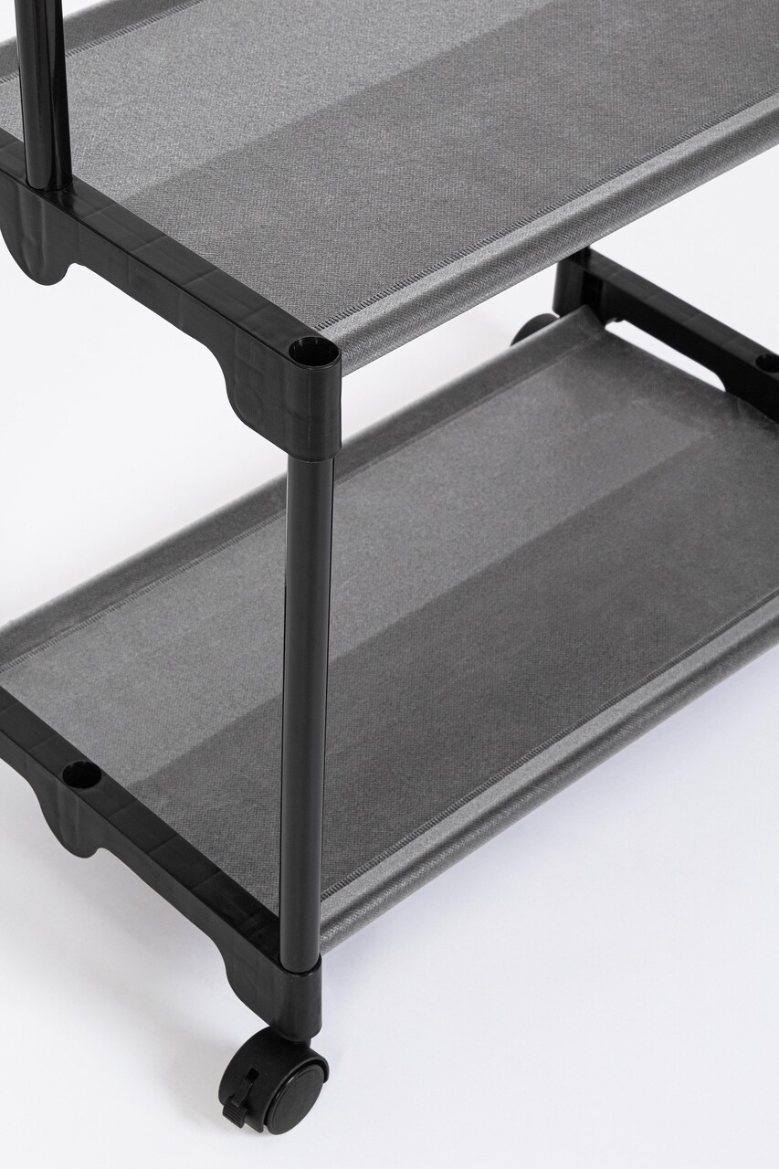 Cadru din otel acoperit cu pulbere epoxidica, rafturi din TNT, cu 4 roti din polipropilena.