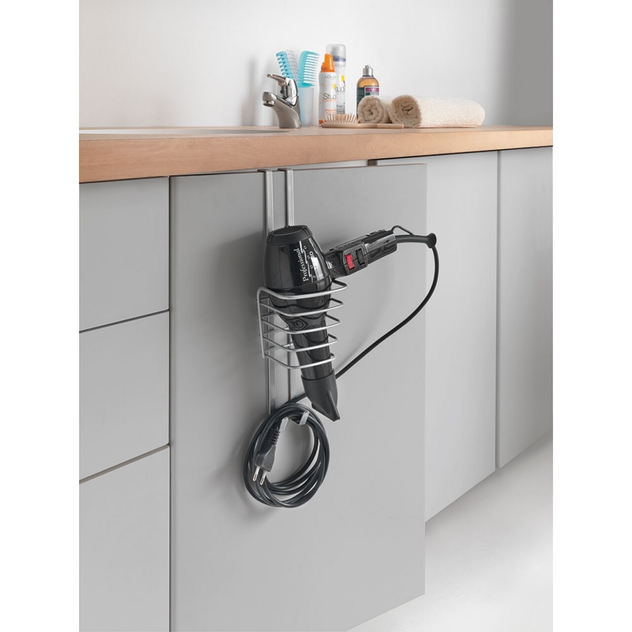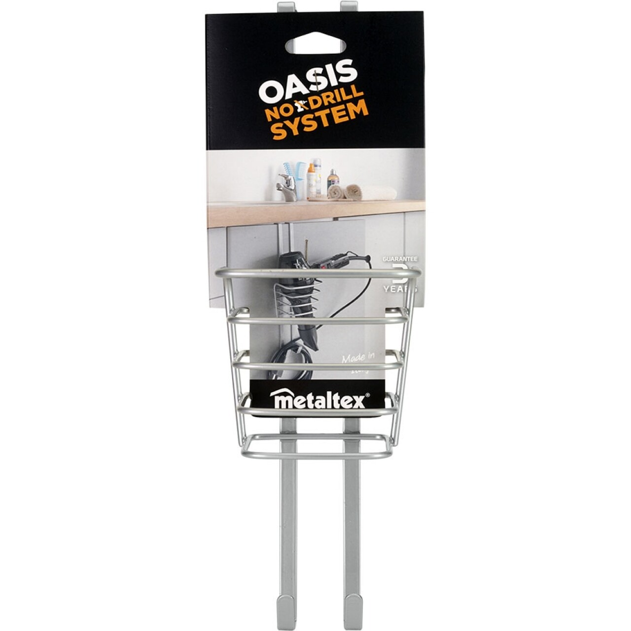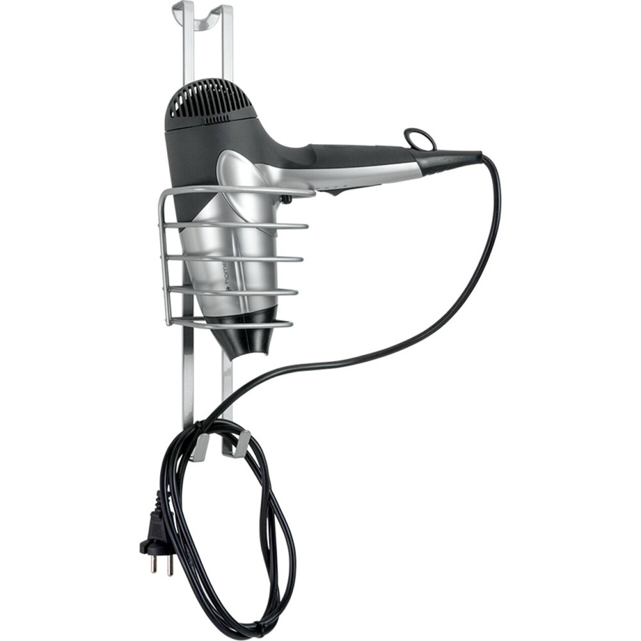 Suport pentru uscator de par Oasis, Metaltex, 11x13x37 cm, metal/ invelis Polytherm, argintiu