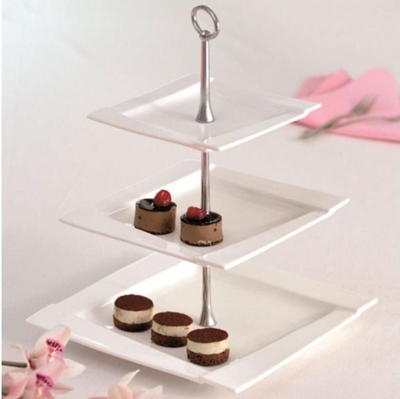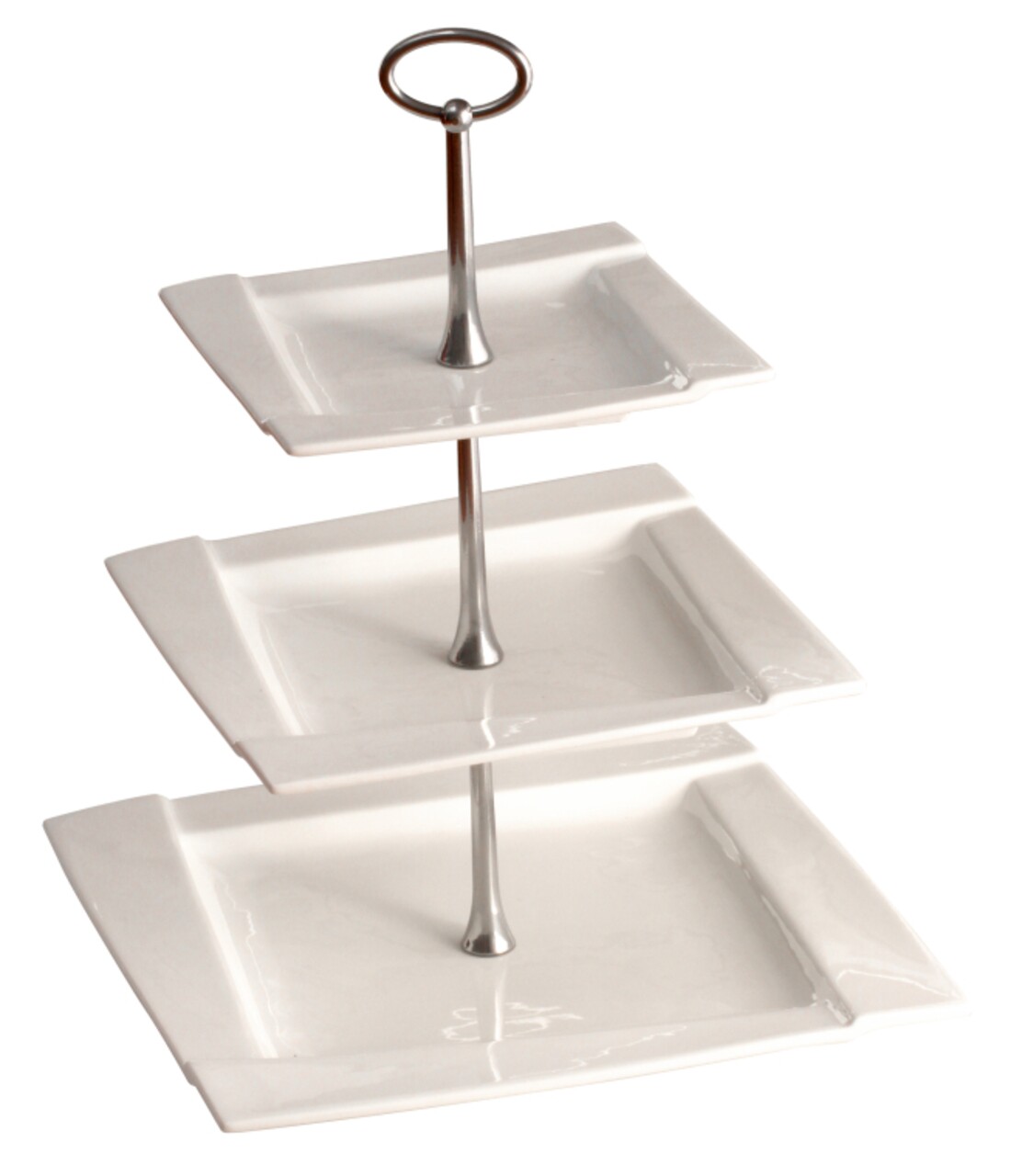 Suport pentru prajituri, din portelan de inalta calitate. Cu un design simplu insa foarte elegant si 3 etaje incapatoare, acesta este ideal pentru servirea desertului cu un plus de stil.
