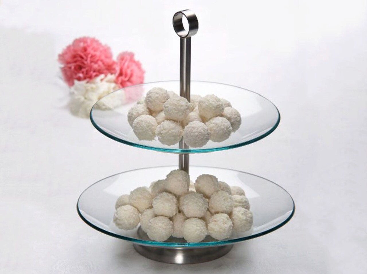 Suport pentru prajituri cu doua etaje rotunde din sticla. Cu un design clasic insa elegant, este ideal pentru servirea desertului preferat alaturi de invitati.