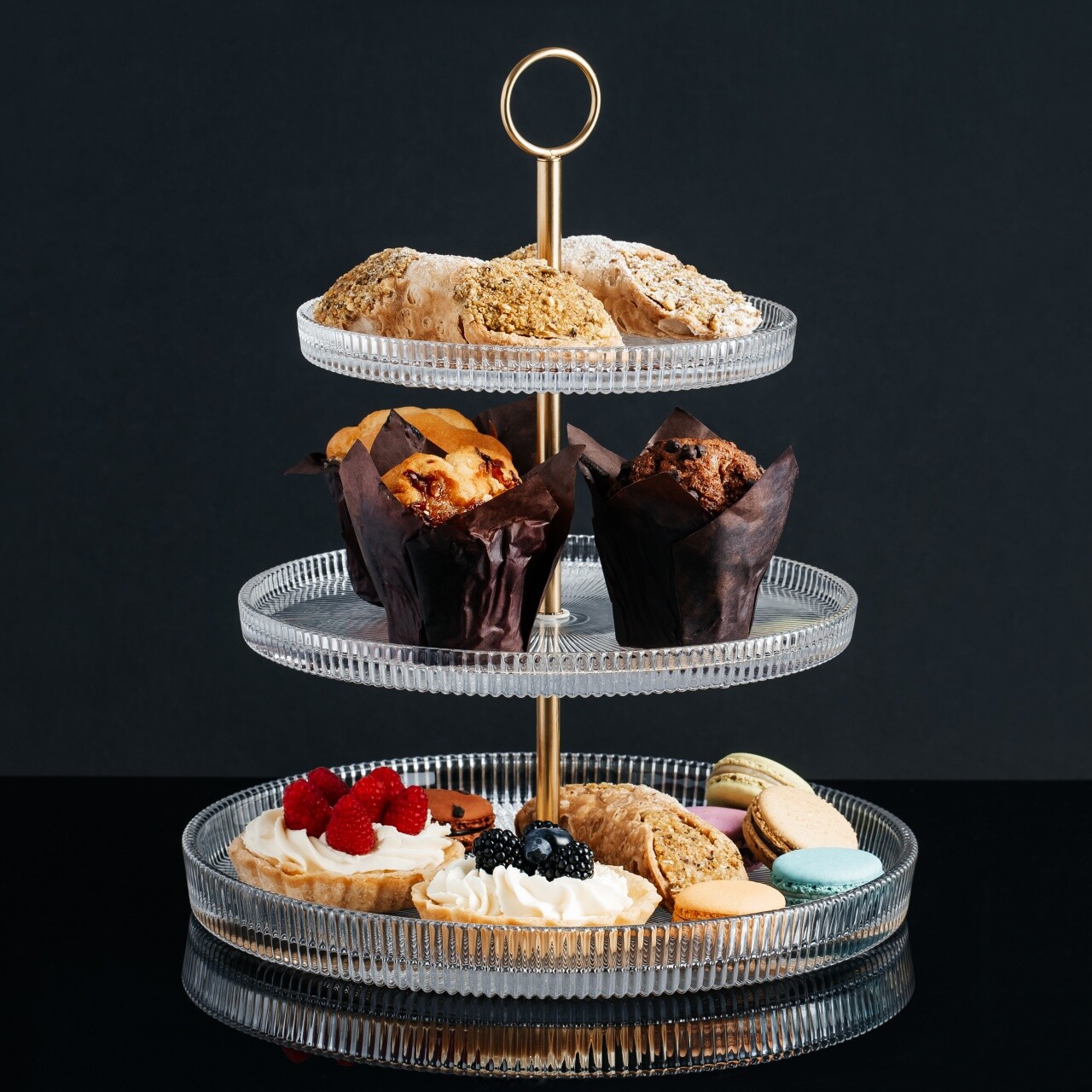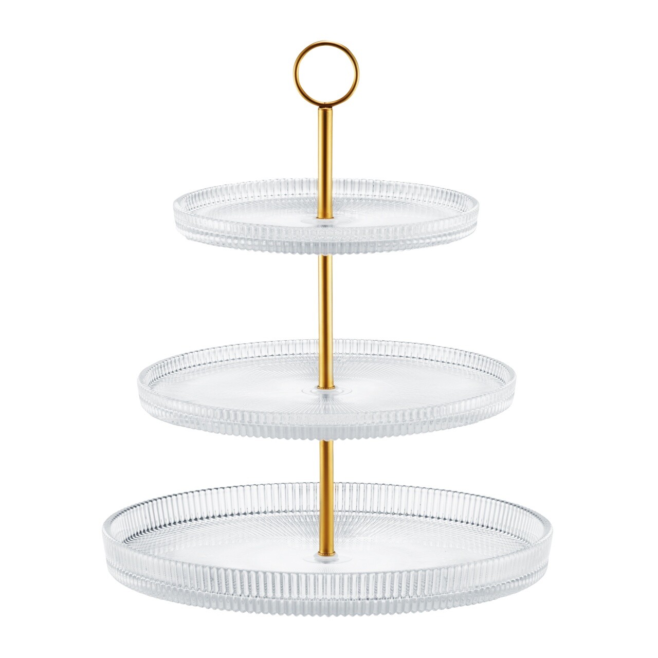 Suport prajituri cu 3 etaje Curly, Ambition, 19 cm/24 cm/29 cm, otel/sticla, auriu/transparent