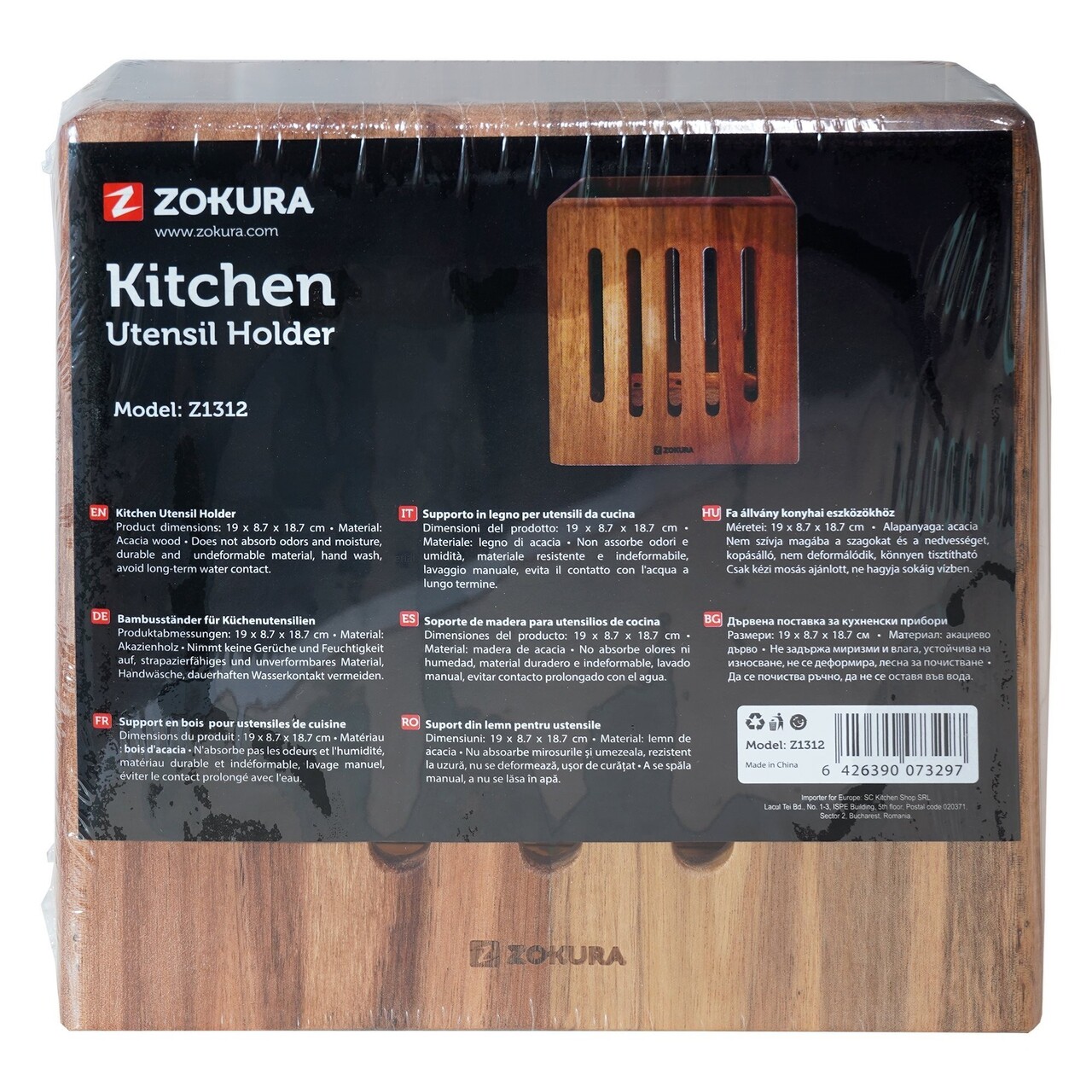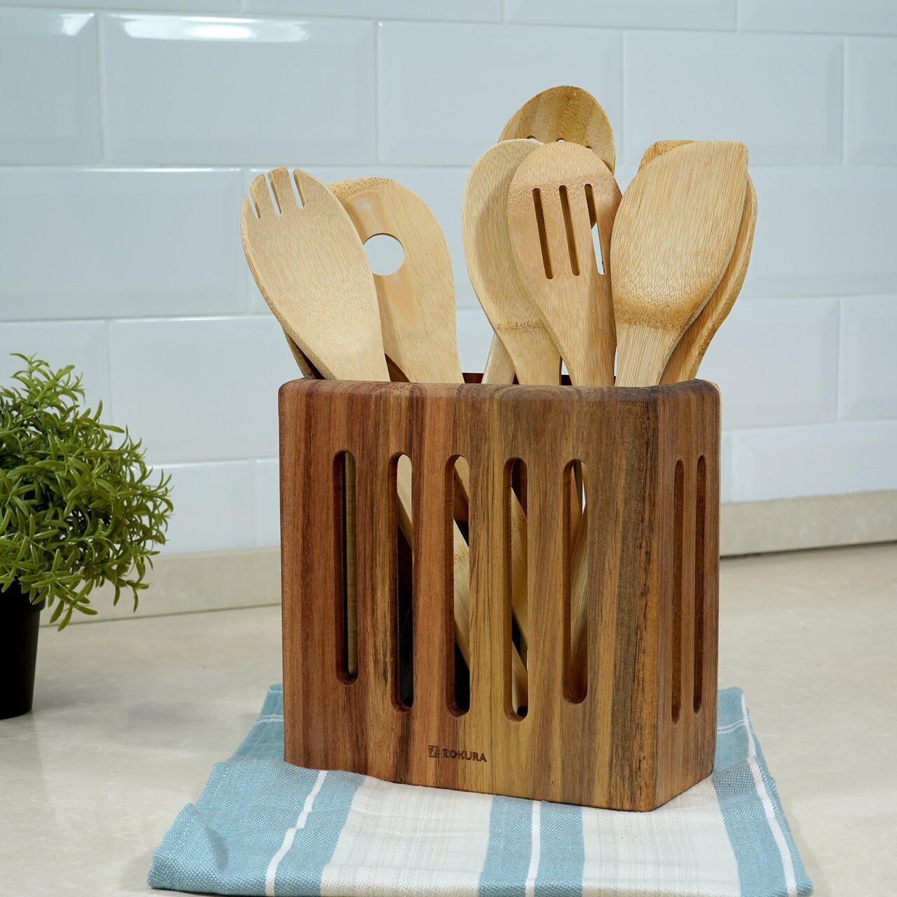 Suport pentru ustensile, Din lemn de acacia, Dimensiune 19 x 8,7 x 18,7 cm, MarcaZokura.