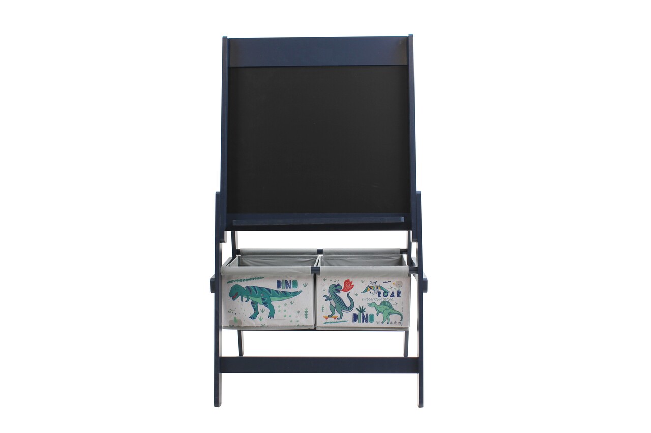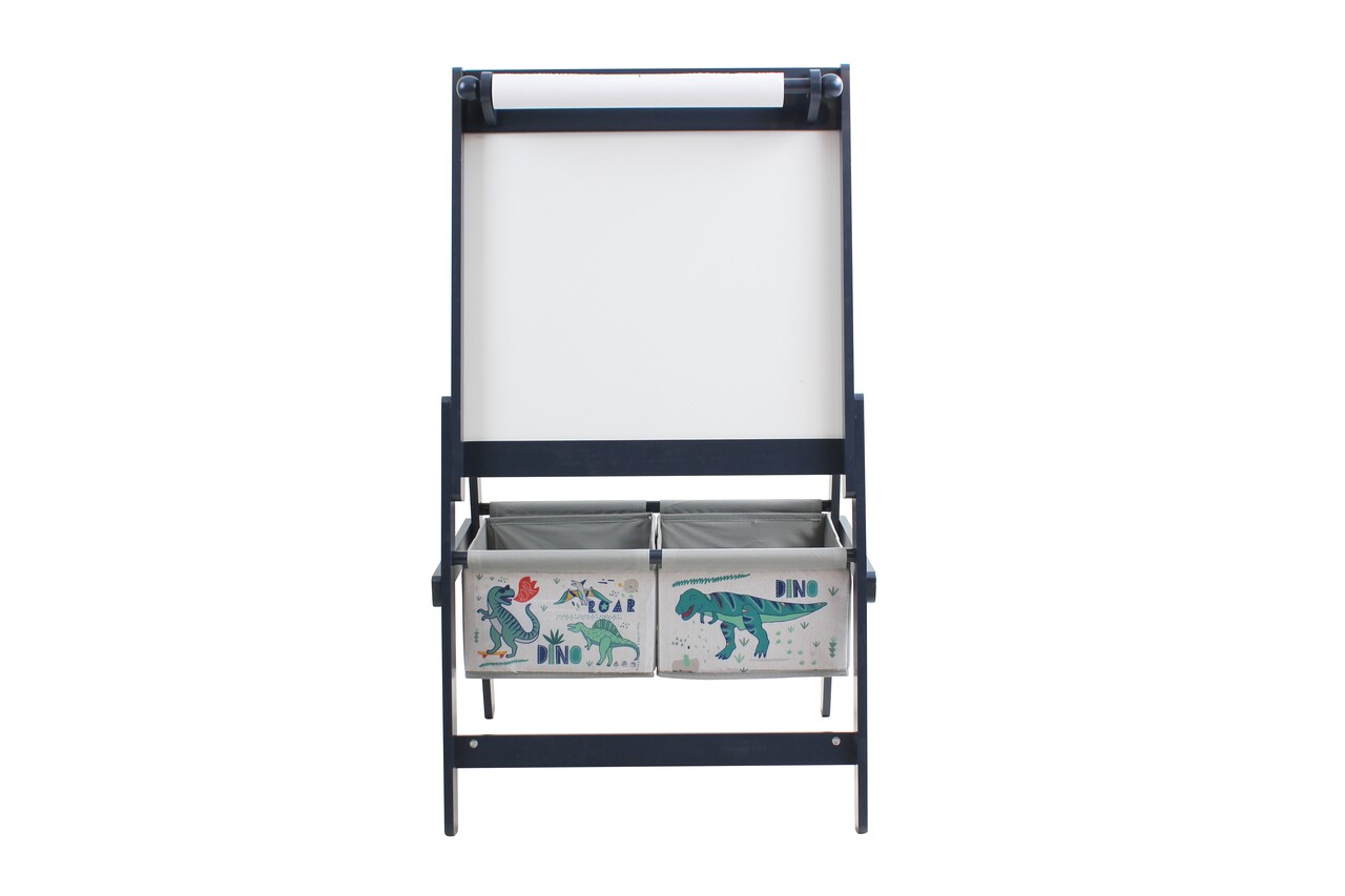 Tabla are doua fete: o fata alba pentru desen, cu rola de hartie inclusa si una neagra pentru desen sau pentru scriere cu creta;