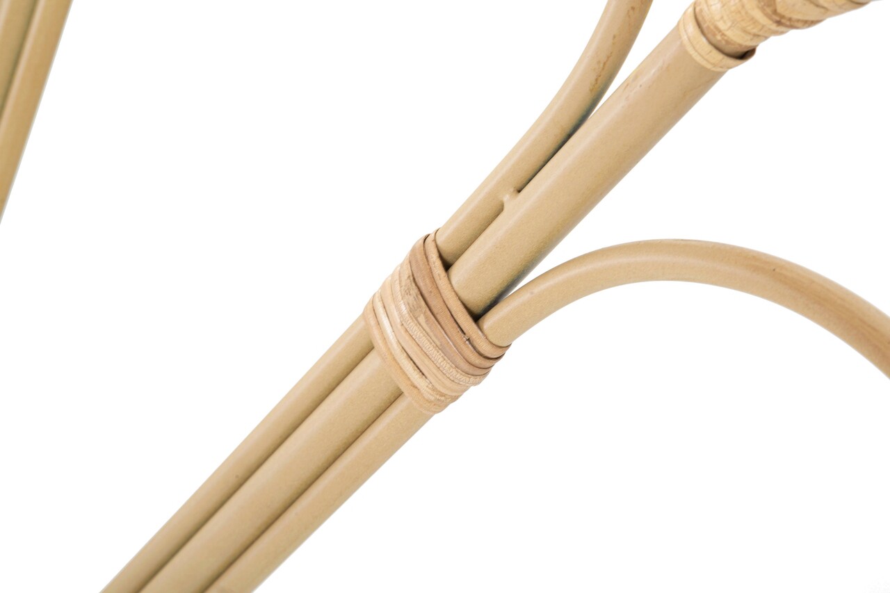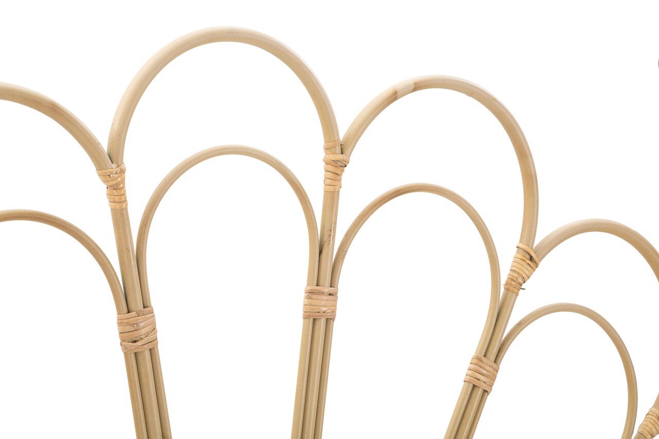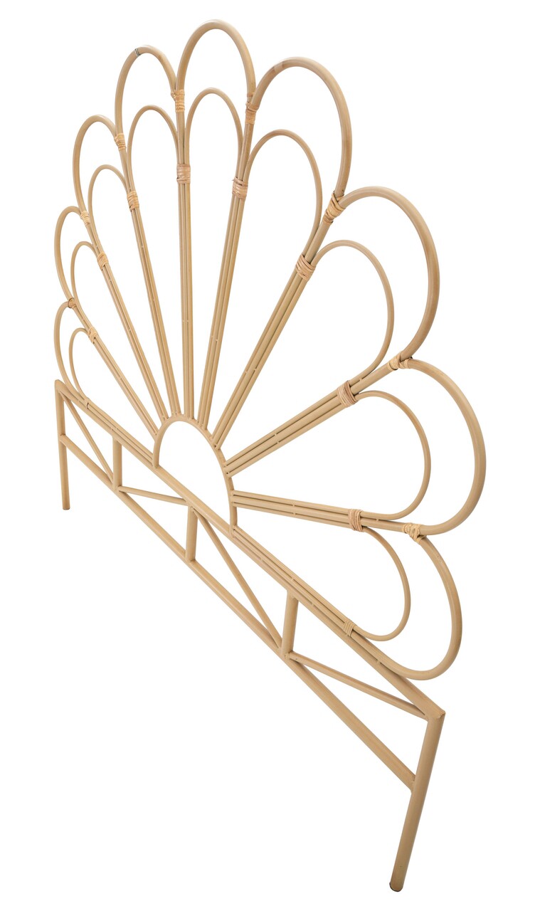 Tablie de pat din metal si ratan, cu un design rotunjit si linii fluide care amintesc de petalele unei flori.