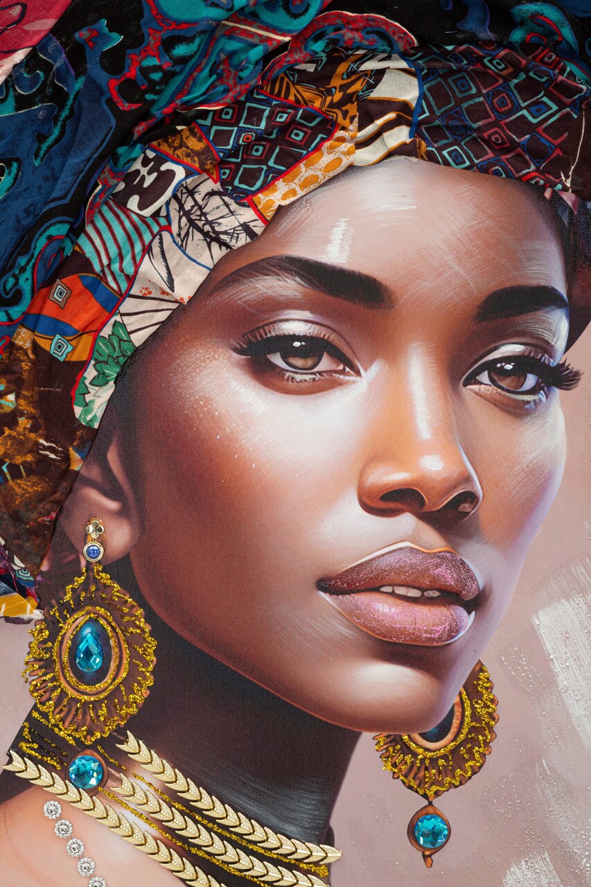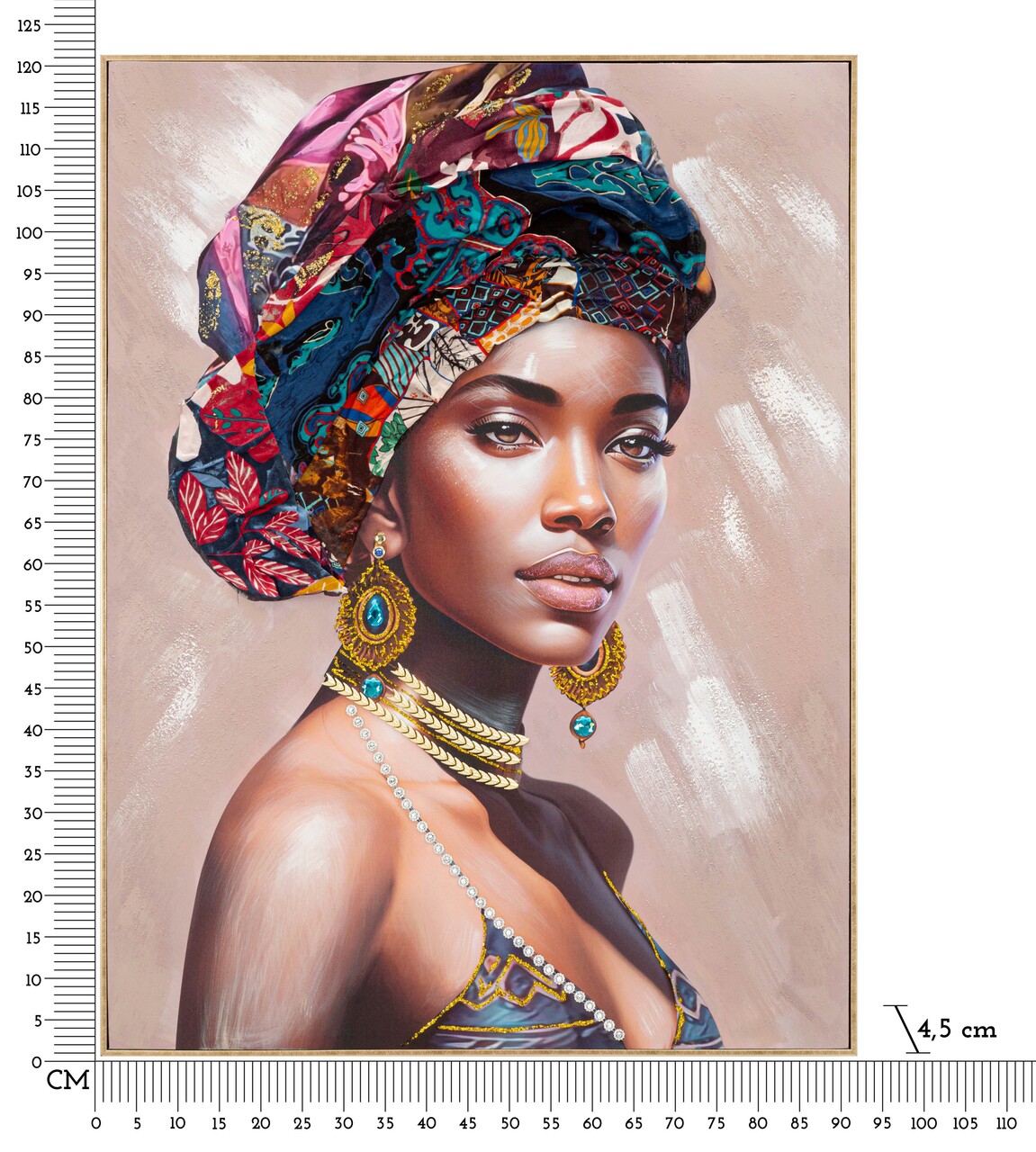Pictura pe panza cu rama de lemn reprezentand o femeie cu un turban realizat cu aplicatii textile deosebite. Compozitie material: metal, lemn de brad, canvas pictat.
