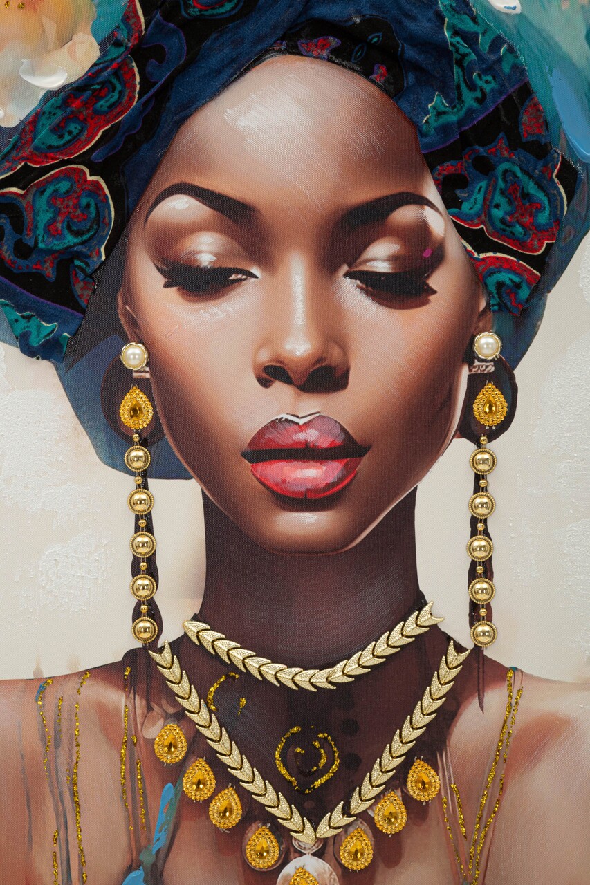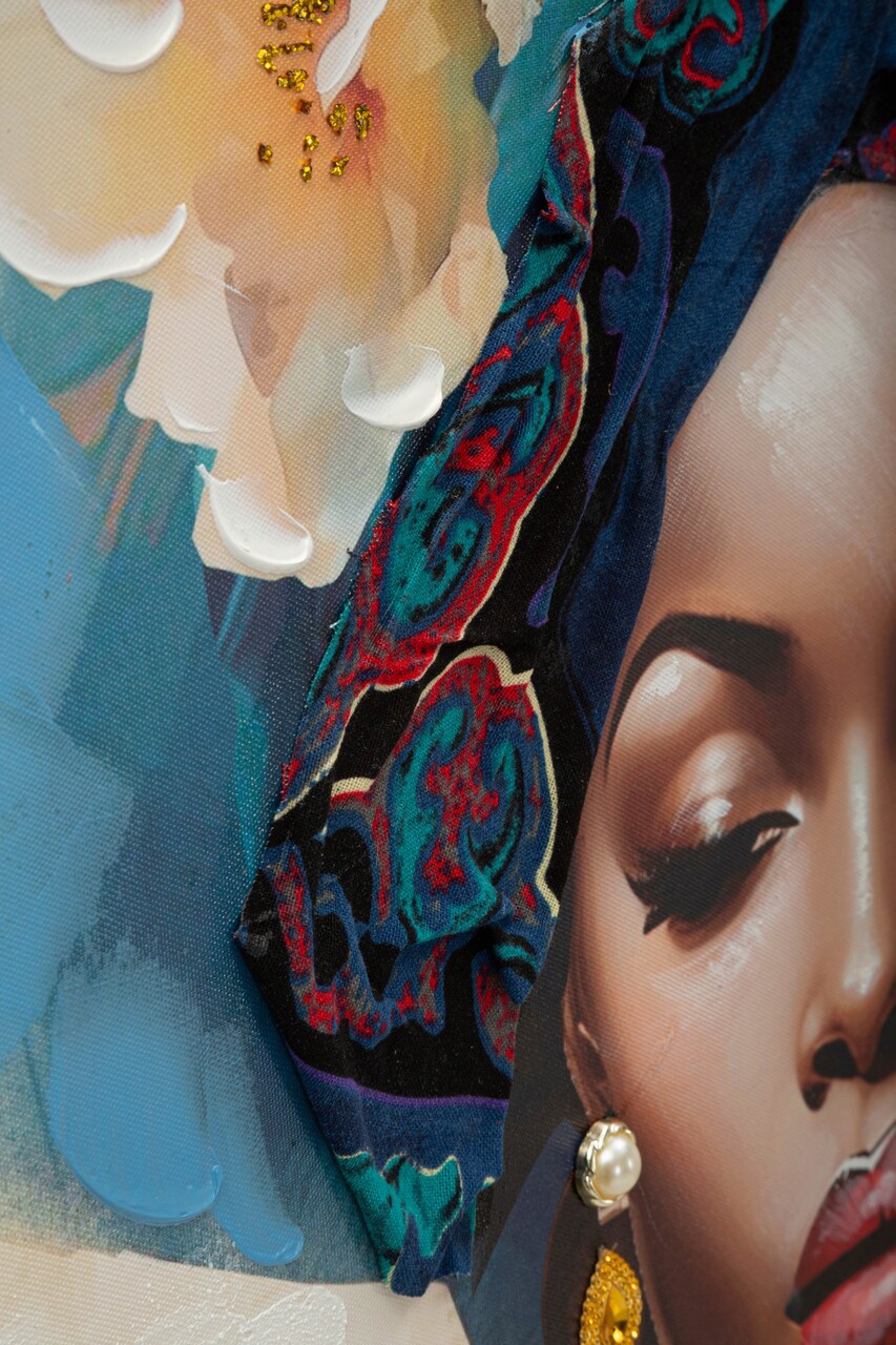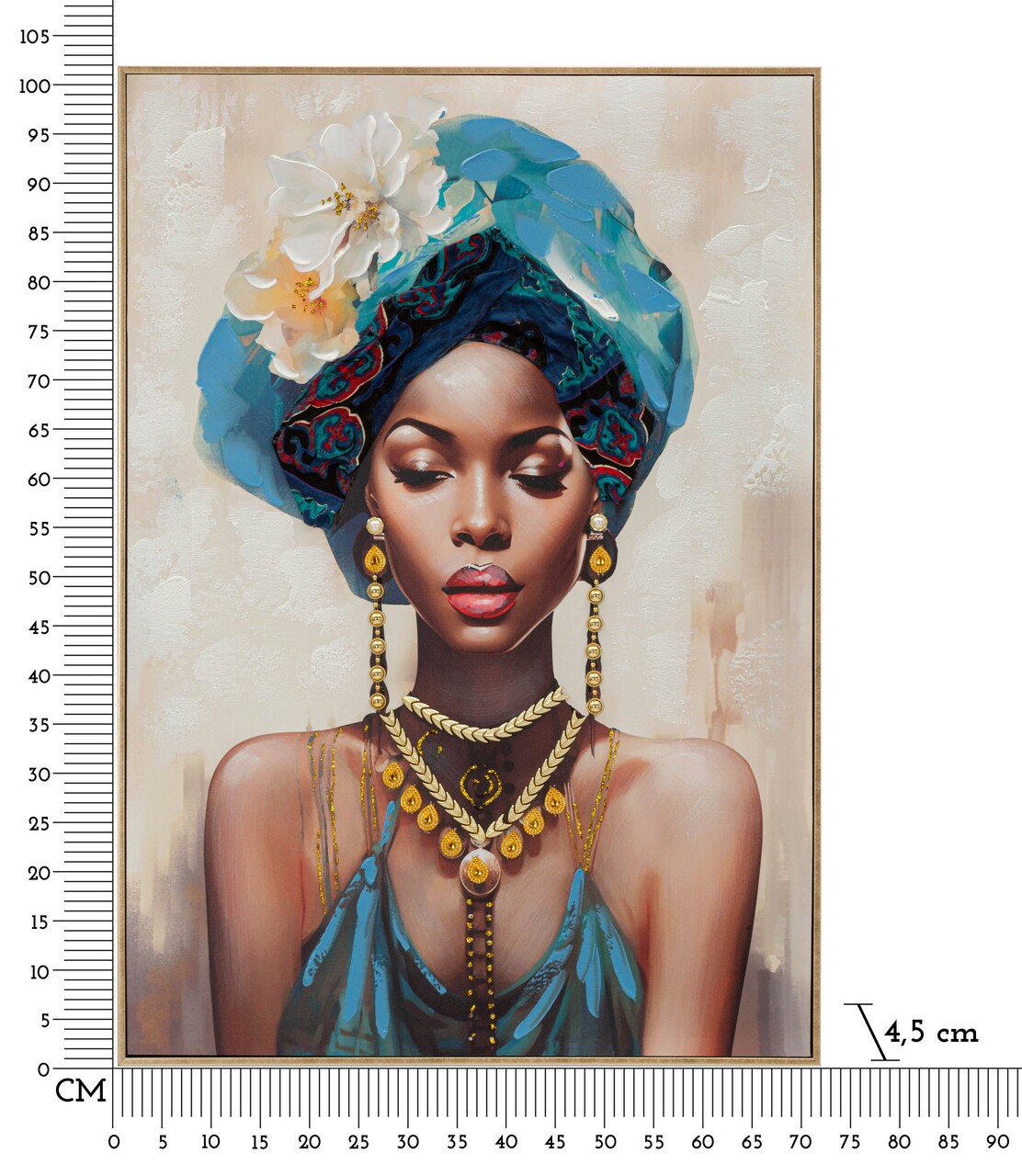 Pictura pe panza cu rama de lemn reprezentand o femeie in haine traditionale si turban. Compozitie material: metal, lemn de brad, canvas pictat.