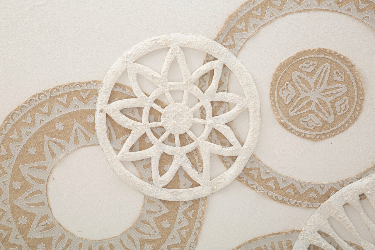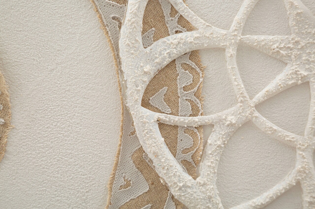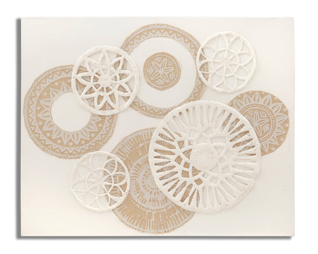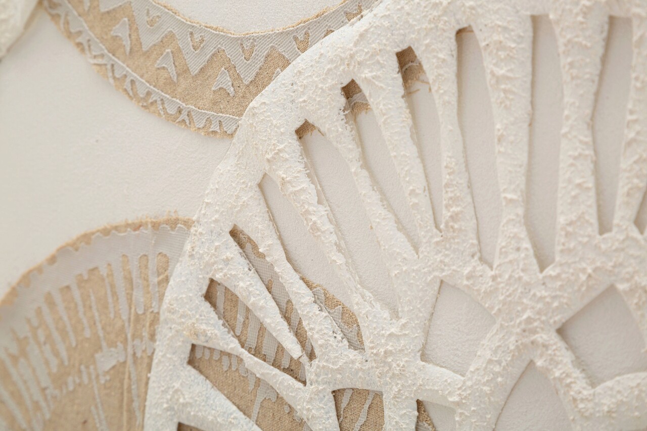 Pictura pe panza cu rama, imbogatita cu decoruri elegante in relief care formeaza motive geometrice in tonuri calde si invaluitoare.