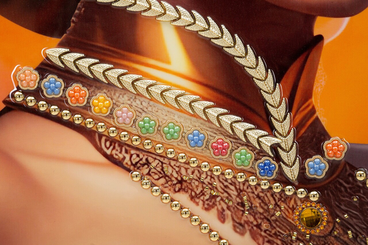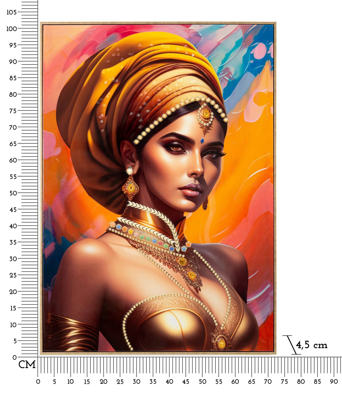 Pictura pe panza cu rama de lemn reprezentand o femeie in haine traditionale si turban. Completat cu rama metalica aurie. Compozitie material: metal, lemn de brad, canvas pictat.