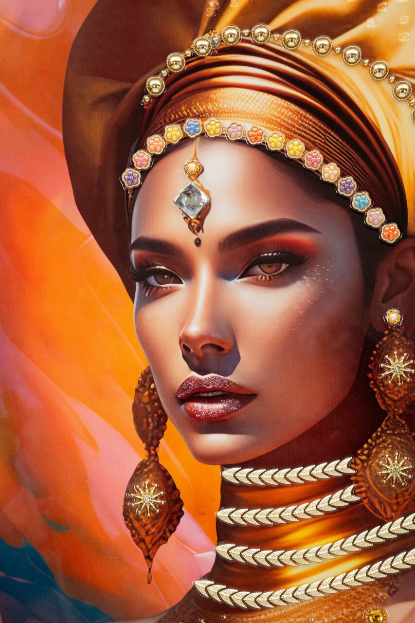 Pictura pe panza cu rama de lemn reprezentand o femeie in haine traditionale si turban. Completat cu rama metalica aurie. Compozitie material: metal, lemn de brad, canvas pictat.