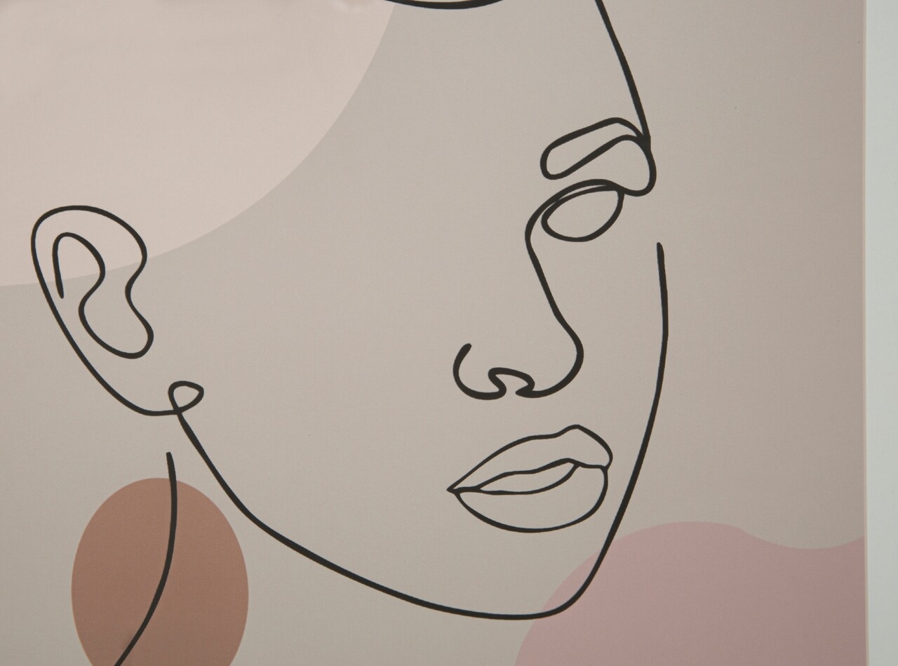 Imprimeu cu rama in culori delicate ce infatiseaza fata unei femei in tonuri minimale.