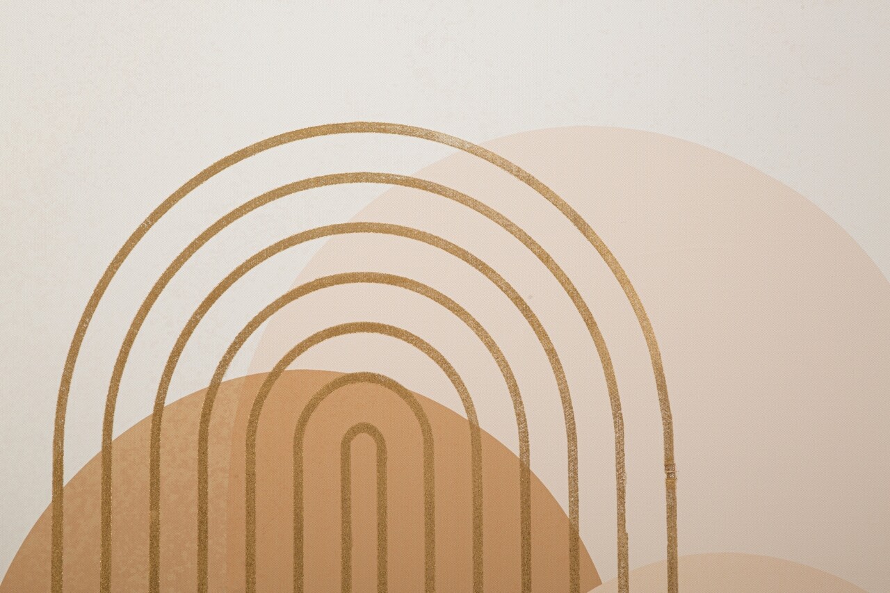 Tablou pictat pe panza, cu rama din lemn, cu un design abstract si tonuri calde impodobite cu decoratiuni aurii.