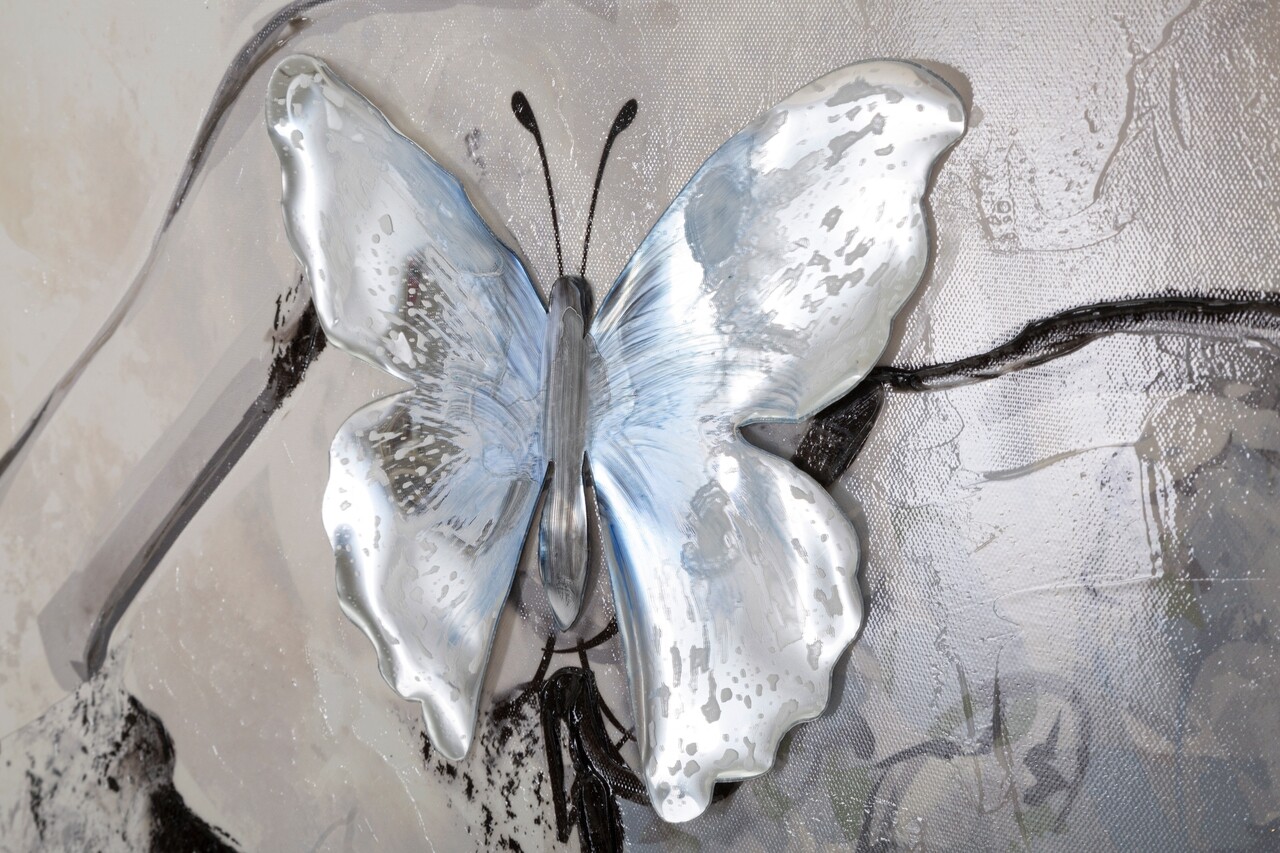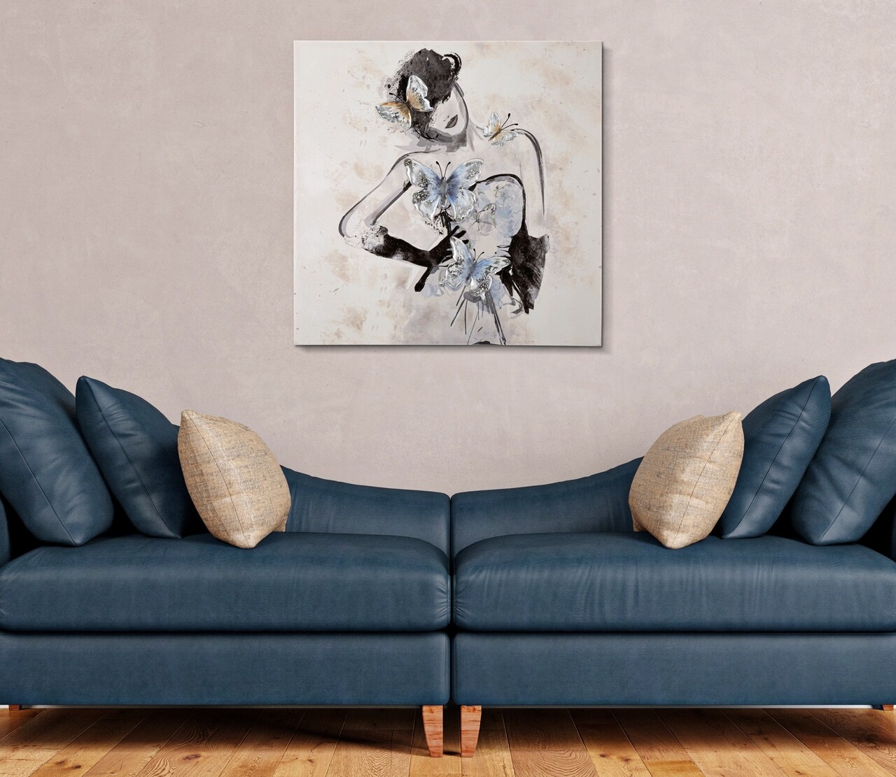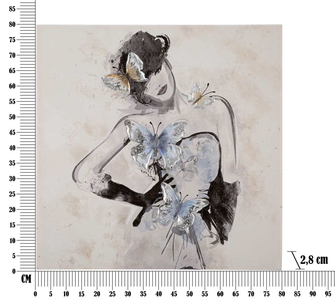 Tablou pe panza cu rama de lemn ce infatiseaza o femeie intr-o rochie alcatuita din fluturi in relief.