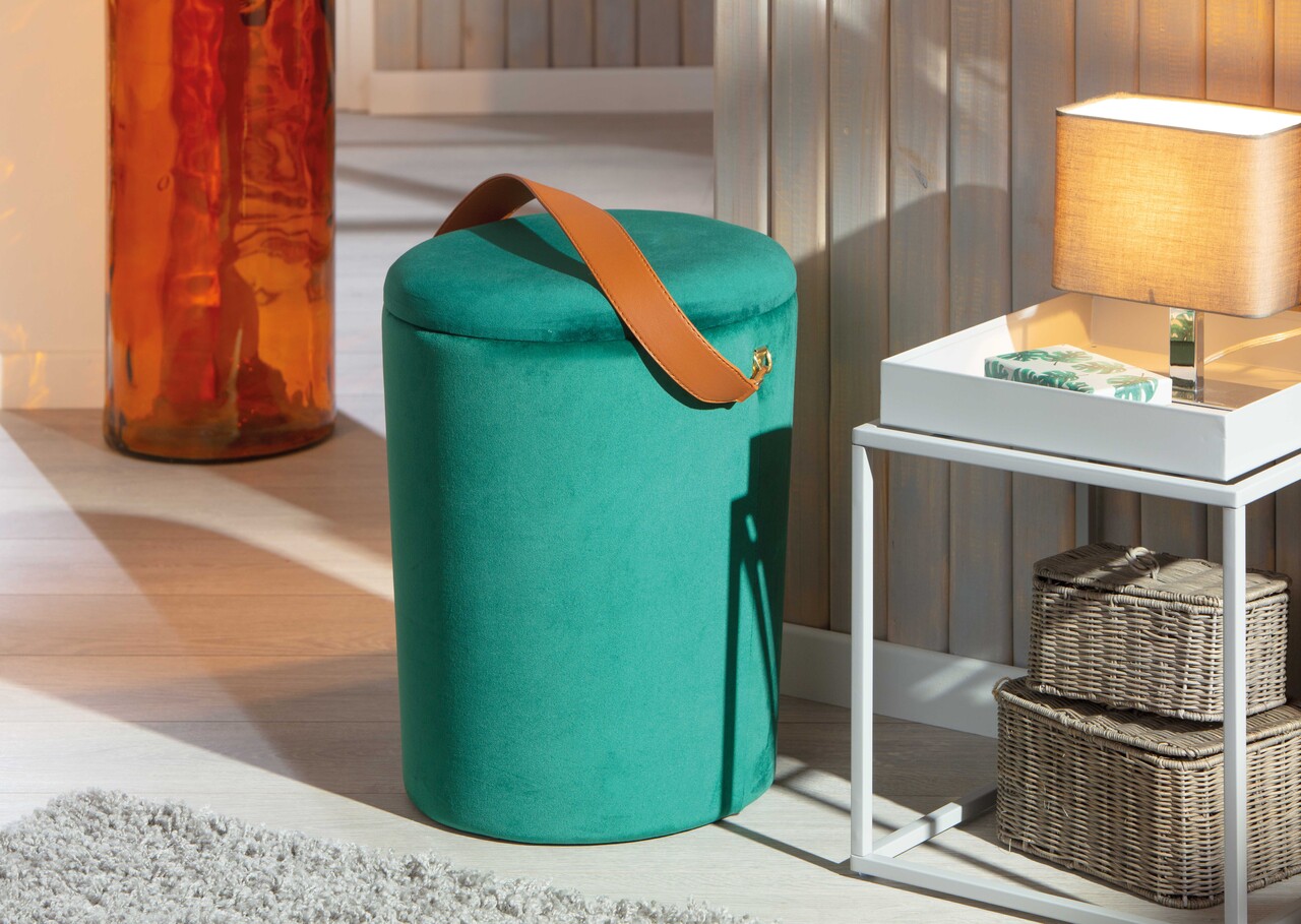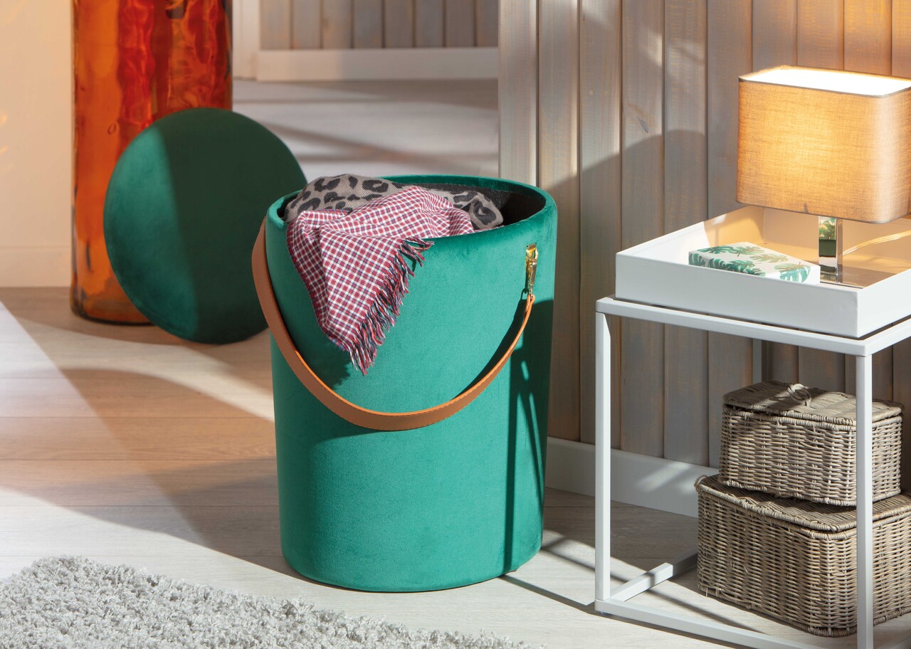 Canapea PAPUA din catifea verde aduce modernitate si moliciune casei tale. Este perfecta ca bancheta suplimentara sau piesa de mobilier intr-un living, dar poate fi amplasata si in holul de intrare, dressing sau chiar in dormitor. Capacul detasabil ofera un spatiu convenabil de depozitare. Reviste, paturi, perne, esarfe/manusi, jucarii si alte accesorii pot fi depozitate cu usurinta aici. Economisind spatiu si fiind usoara, poate fi mutata cu usurinta datorita curelei de transport de culoarea camilei.