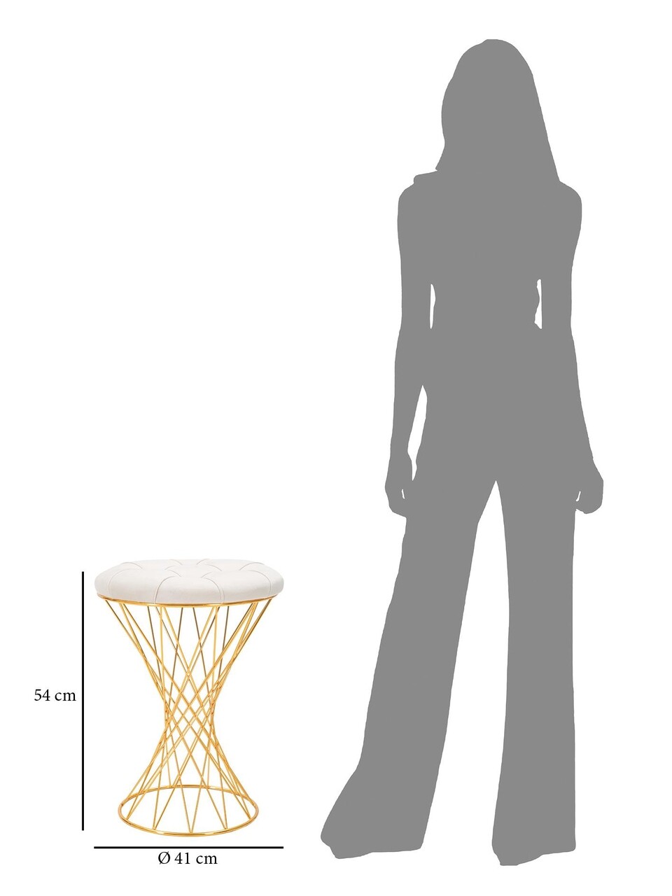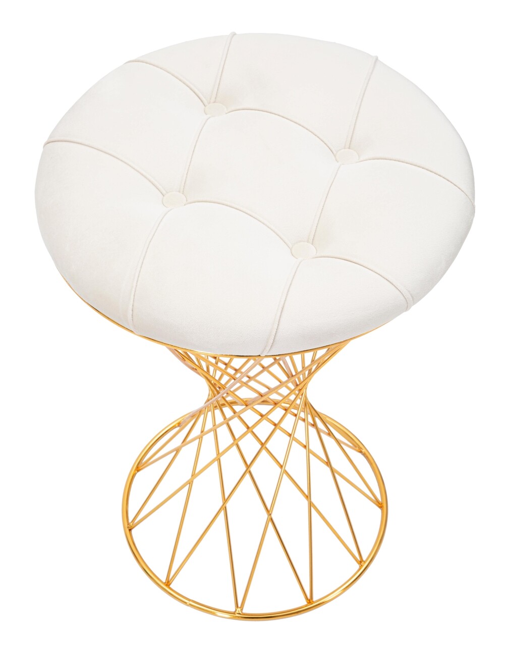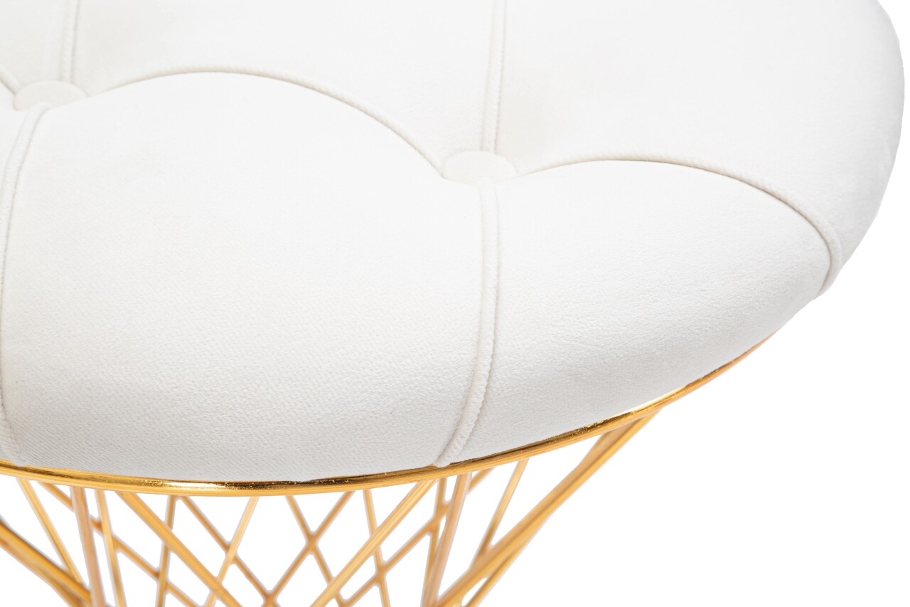 Taburet cu structura din metal auriu si sezut din catifea sintetica captusita si matlasata. Designul compus din linii care se intrepatrund unele cu altele confera o nota de magie oricarei incaperi.