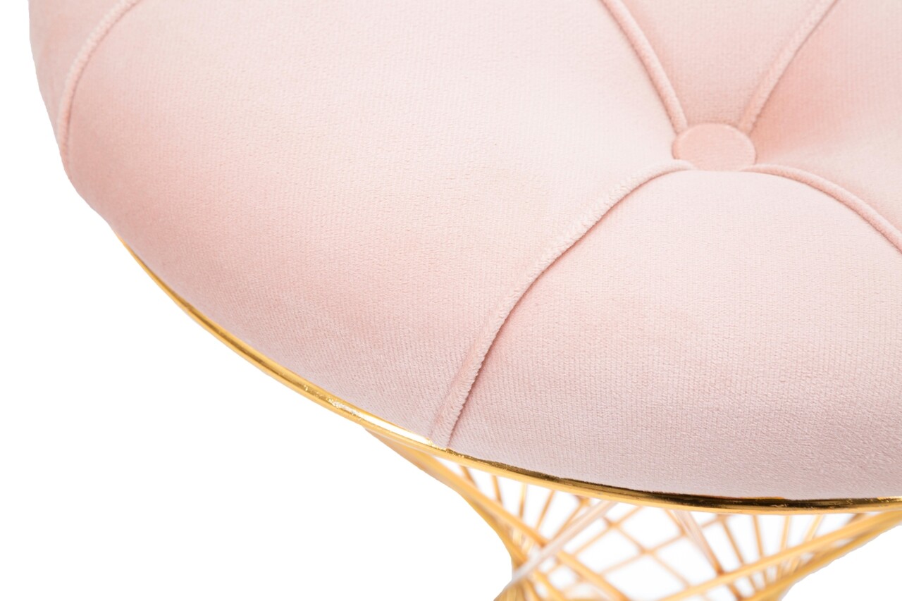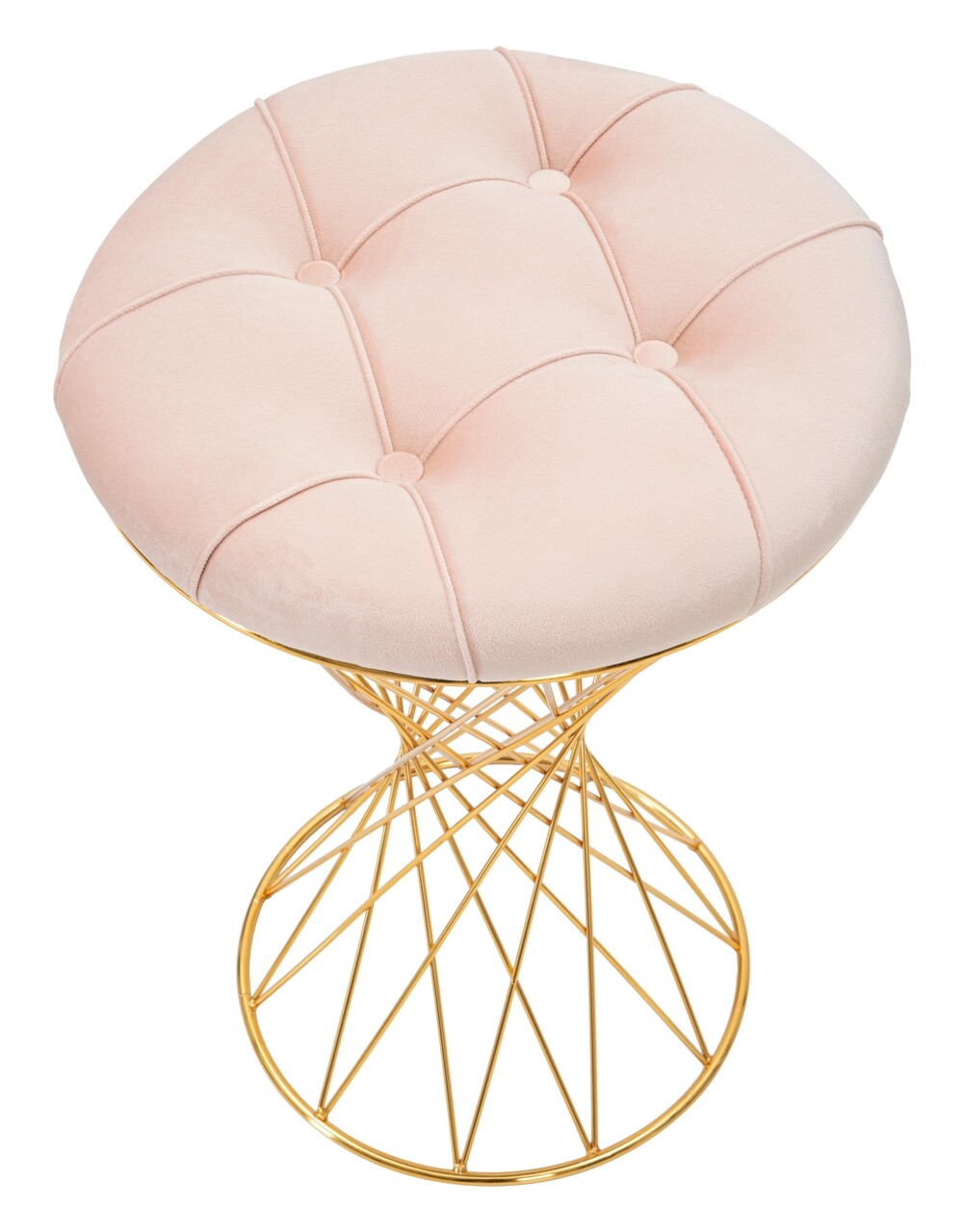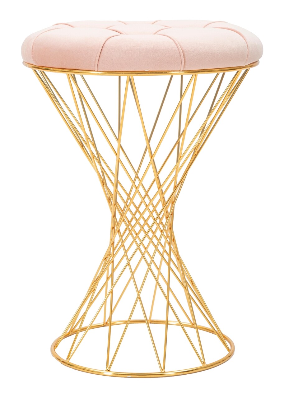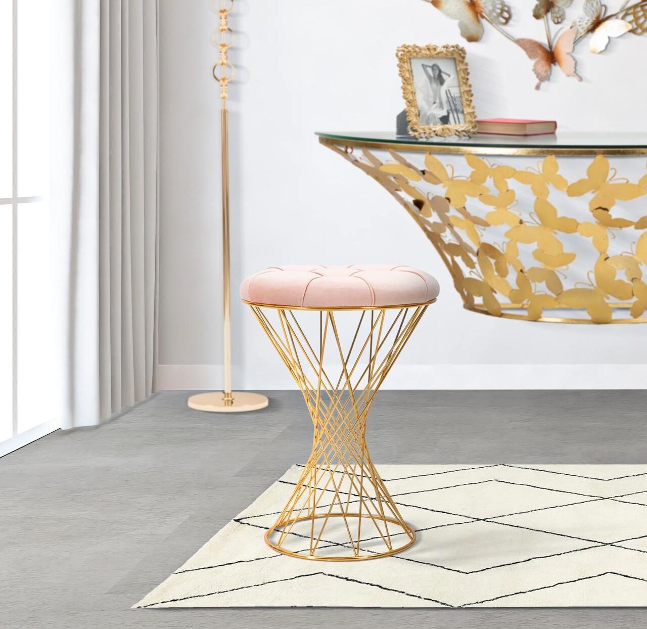 Taburet cu structura din metal auriu si sezut din catifea sintetica captusita si matlasata. Designul compus din linii care se intrepatrund unele cu altele confera o nota de magie oricarei incaperi.