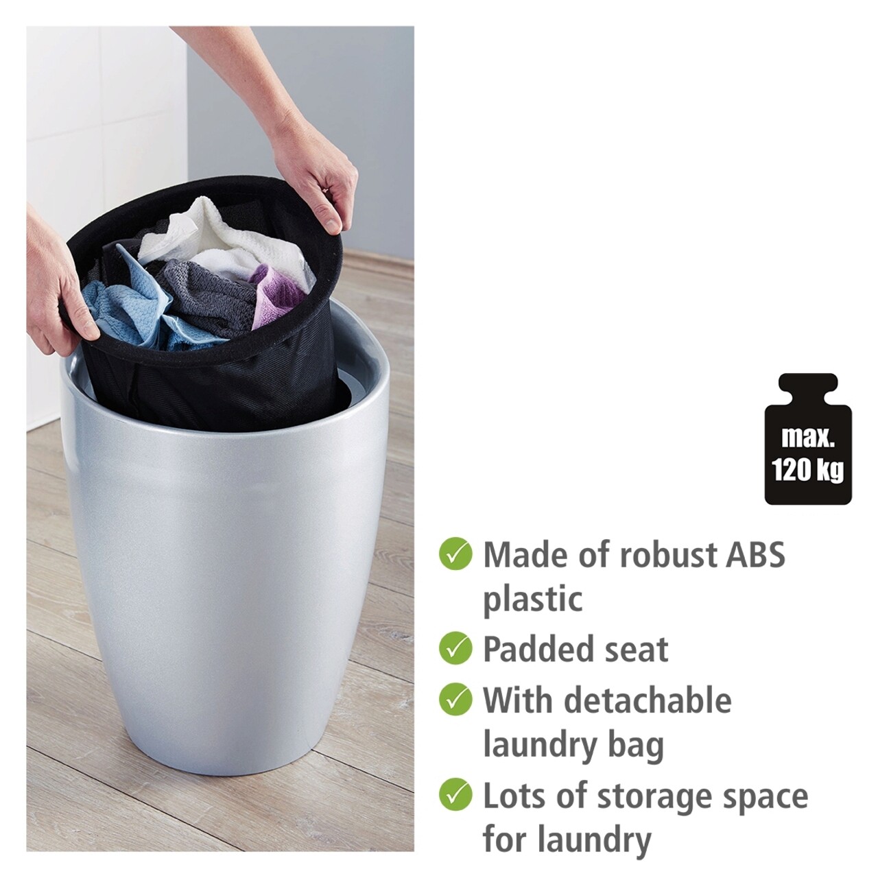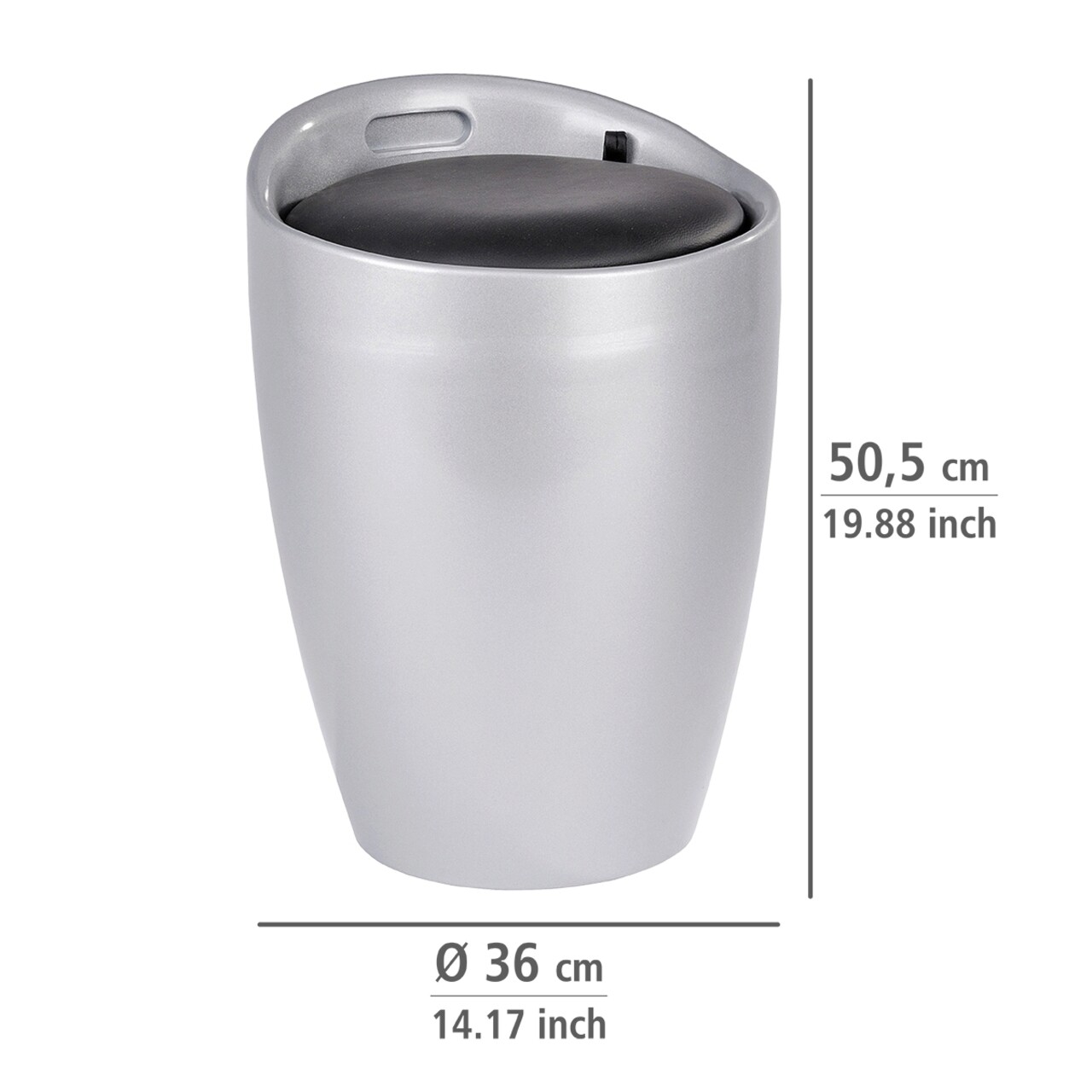 Taburet, Wenko, Candy Silver, cos de rufe inclus, 55 L, plastic/poliester, gri/negru