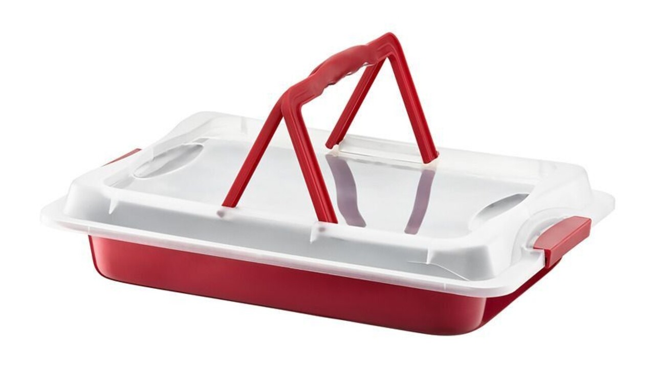 Tava pentru prajituri cu capac Cherry, Ambition, 42x29 cm, otel carbon, rosu