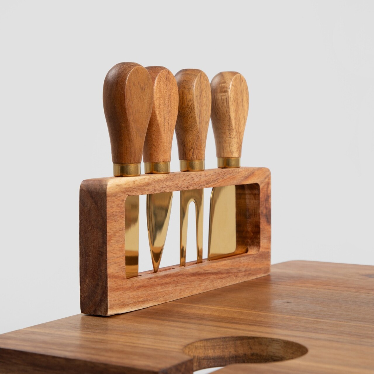 Setul include 6 elemente: O tava si 4 cutite cu maner plasate intr-un suport practic.
