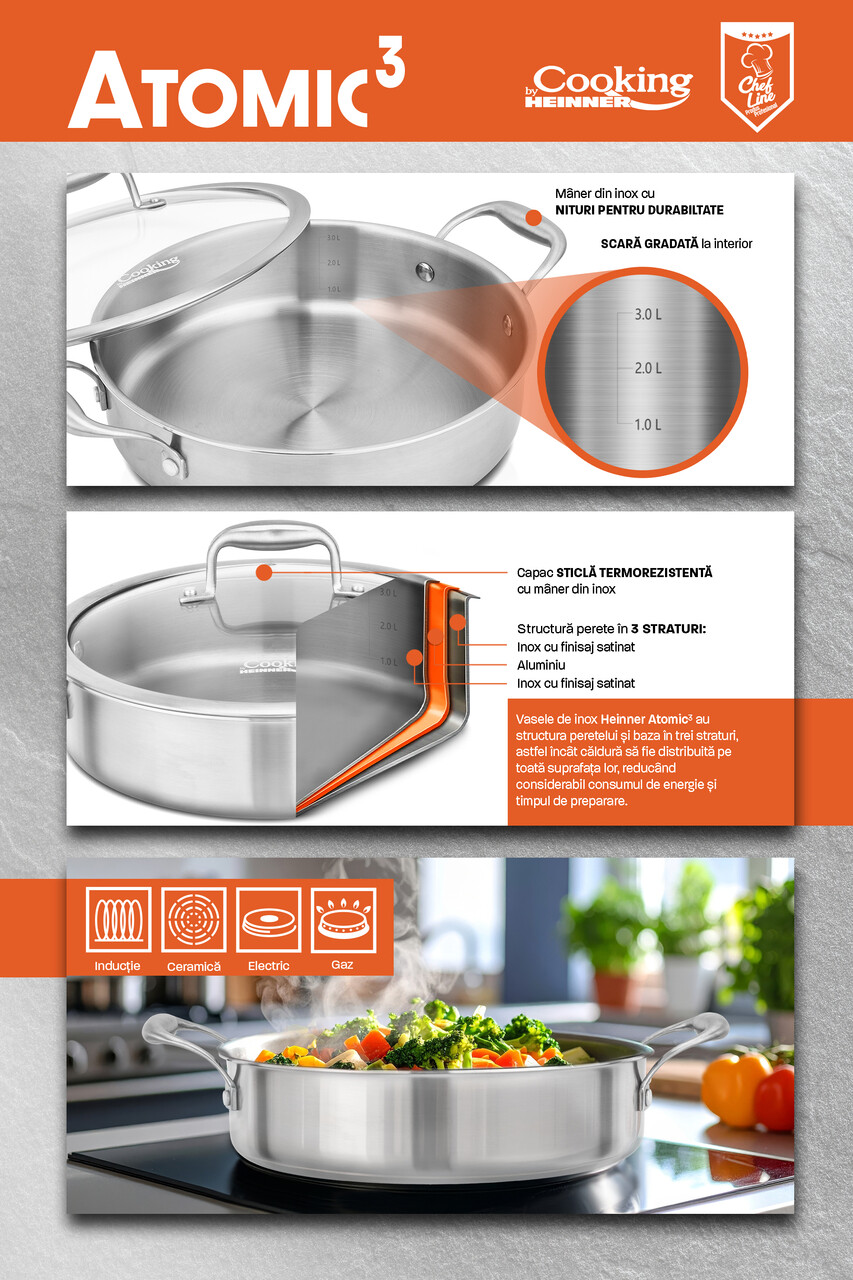 Realizate din otel inoxidabil atent selectionat, vasele Atomic3 sunt concepute sa reziste in timp. Suprafata lor nu este afectata de temperaturi ridicate si isi pastreaza aspectul elegant chiar si dupa utilizari repetate. Este genul de investitie care iti ofera siguranta si confort, zi dupa zi, fara compromisuri.