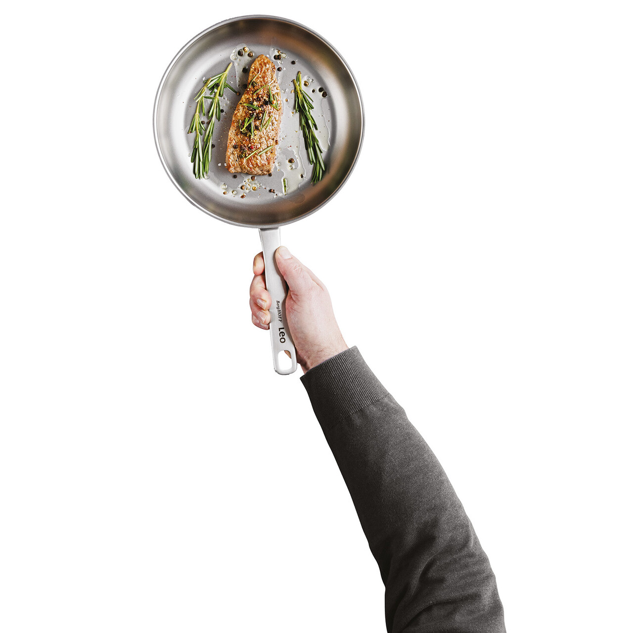 Fie ca este vorba de o portie de omleta sau de o bucata de peste prajit, aceasta tigaie de 24 cm este instrumentul perfect pentru a va ajuta sa pregatiti aceste feluri de mancare si multe altele pe orice tip de aragaz, inclusiv pe inductie, fiind rezistenta la cuptor pana la 250°C. Tigaia din otel inoxidabil reciclat de inalta calitate, cu un finisaj elegant cu aspect de oglinda, aduce o nota de stil, in timp ce baza multistratificata asigura o performanta optima, cu o distributie rapida si uniforma a caldurii pe intreaga suprafata. Cand ati terminat de gatit, masina de spalat vase se va ocupa de curatare, astfel incat sa va puteti bucura de un timp de calitate la masa. Dimensiuni interioare: 24 x 24 x 5 cm. Dimensiuni exterioare: 24.5 x 24.5 x 5.5 cm.