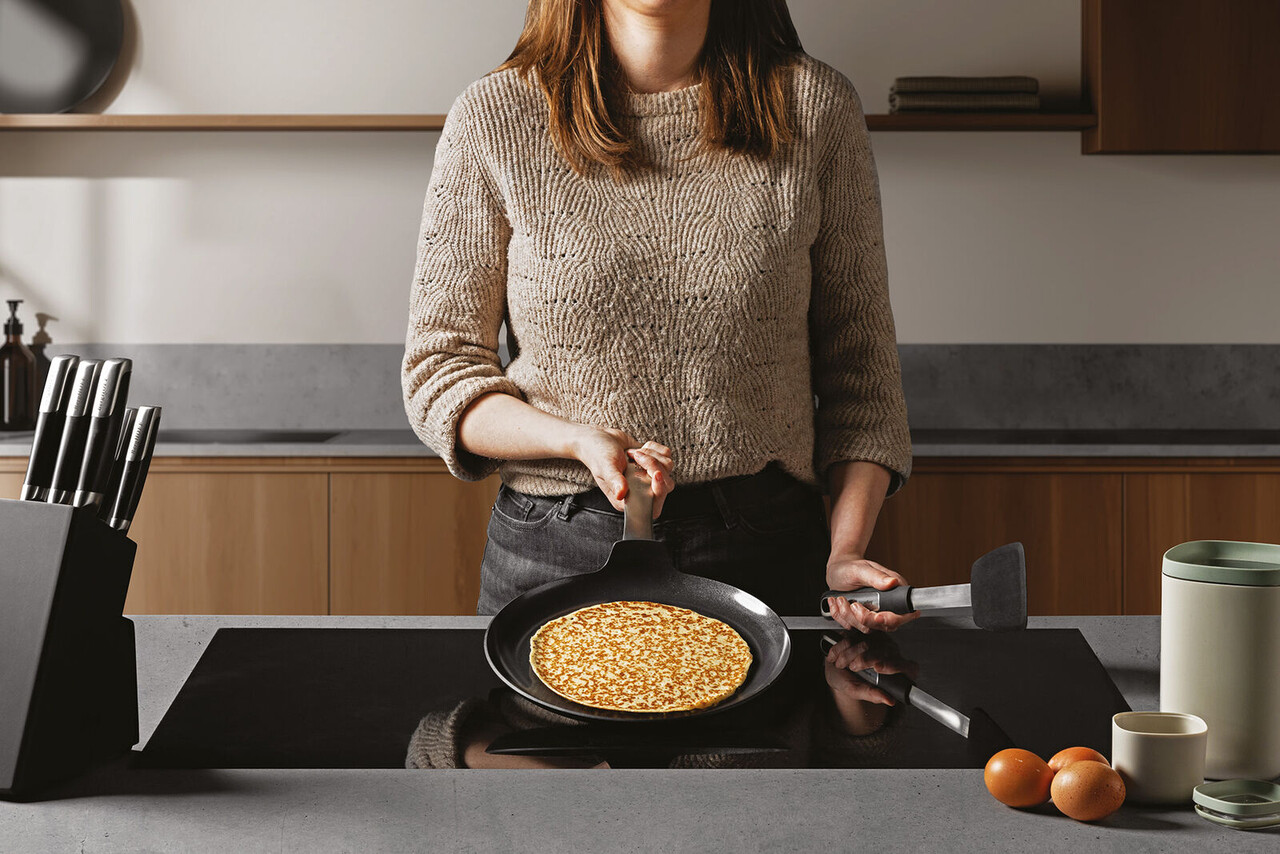 Intotdeauna exista o scuza buna pentru a incepe sa faci clatite! Faceti cele mai incredibile clatite cu aceasta tigaie pentru clatite. Cu corpul sau din aluminiu 100% reciclat care garanteaza o distributie rapida si uniforma a caldurii si cu stratul sau antiaderent ceramic de inalta calitate, durabil si sanatos, care va permite sa gatiti cu putin sau deloc ulei. Aceasta tigaie asigura o performanta eficienta din punct de vedere energetic pe toate tipurile de plita. Dimensiuni interioare: 26 x 26 x 4.7 cm. Dimensiuni exterioare: 26.9 x 26.9 x 44.1 cm.