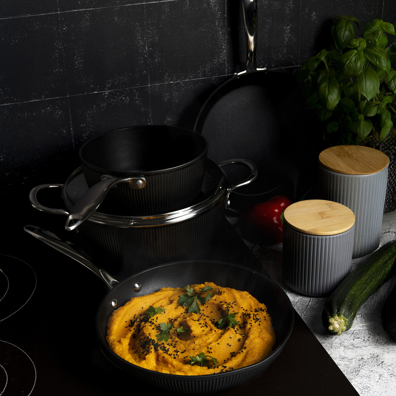 Colectia de vase de gatit Ambition Curly reprezinta o combinatie de eleganta, functionalitate si calitate superioara. Negrul clasic, elegant, combinat cu modelul canelat al acestora si manerele din otel sunt ideale pentru cei care apreciaza produsele de inalta calitate si designul de neegalat. Oalele si tigaile canelate sunt fabricate din aluminiu forjat de inalta calitate care este rezistent la deformare, asigurand o durata lunga de viata a produsului. In plus, aluminiul forjat se incalzeste uniform si acumuleaza perfect caldura, facand gatitul mai economic. Manerele confortabile din otel stau perfect in maini si permit folosirea vaselor in cuptor. La interior, oalele si tigaile sunt acoperite cu un strat antiaderent de inalta calitate Qualum Basic care este un strat de acoperire cu proprietati antiaderente semnificative si rezistenta ridicata la abraziune. Vasele cu acoperire antiaderenta sunt foarte usor de curatat. Oalele si tigaile ondulate au un fund gros cu inductie si sunt potrivite pentru utilizare pe toate tipurile de aragaz, inclusiv pe cele cu inductie. Se pot folosi si la cuptor pana la 220° C.