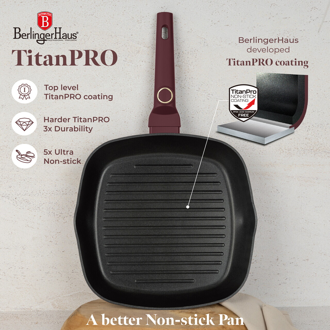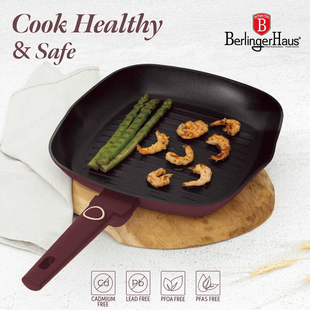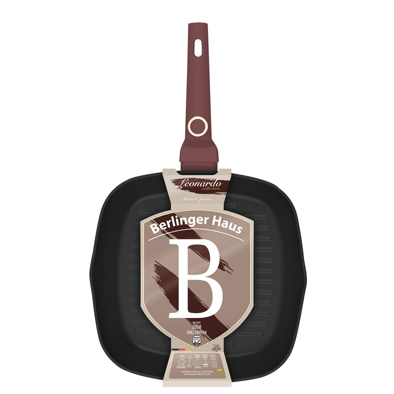 Tigaie grill Berlinger Haus, Leonardo, 28 cm, 2.1 L, aluminiu forjat, visiniu mat