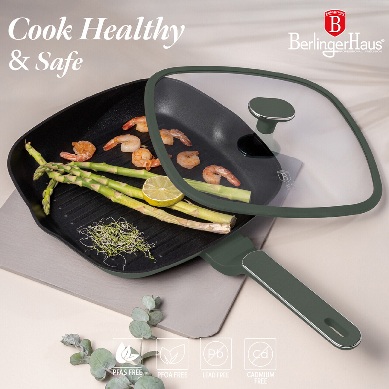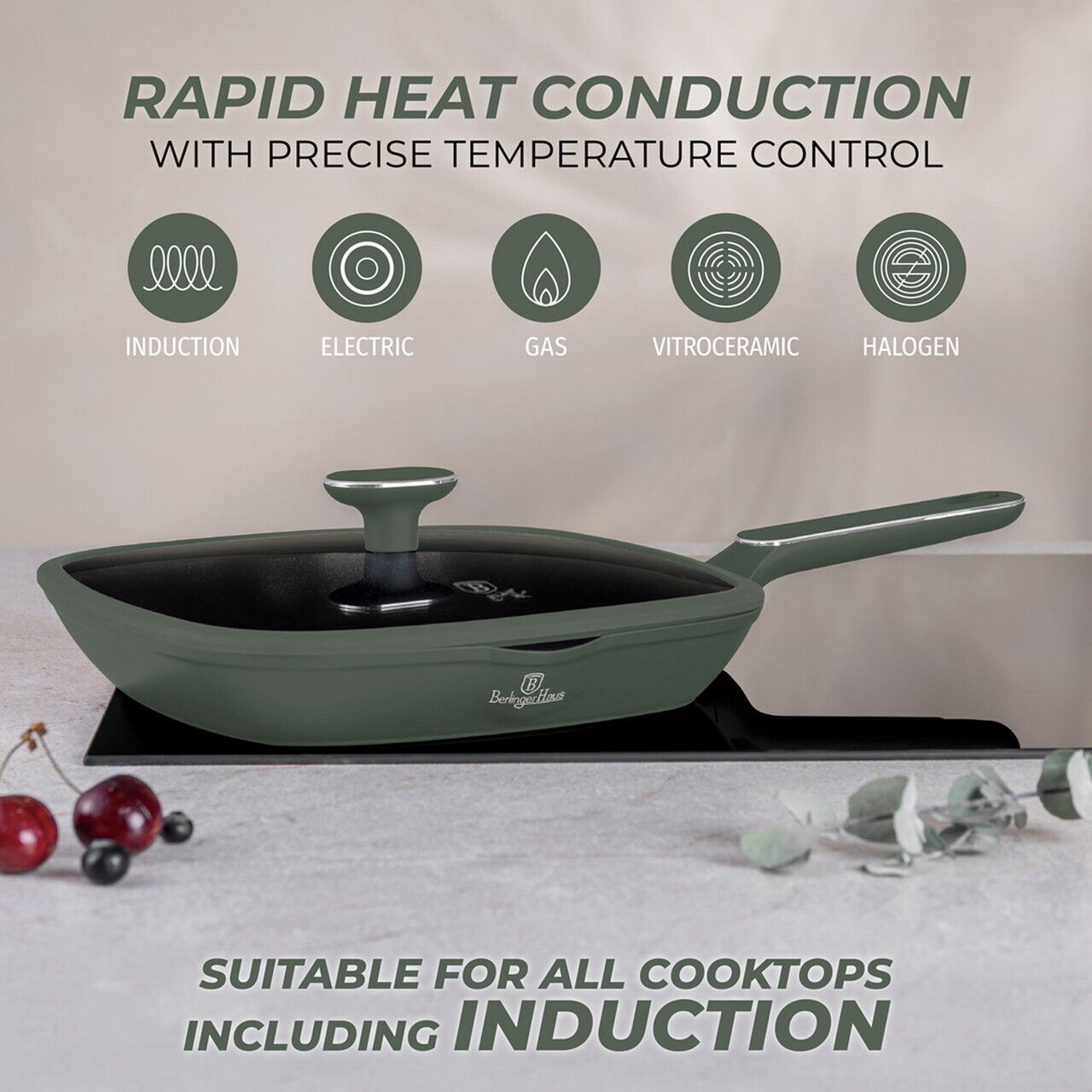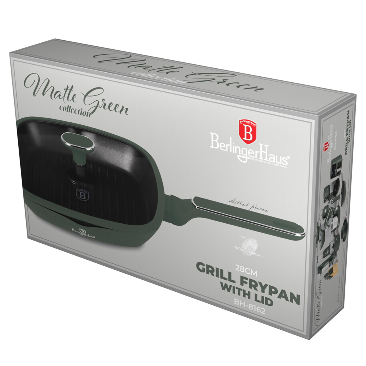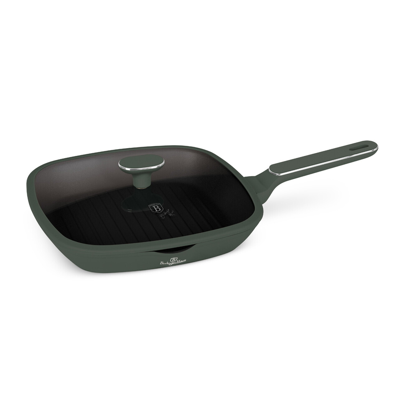 Tigaie grill cu capac Berlinger Haus, Matte Green, 28 cm, 2.1 L, aluminiu forjat, verde mat