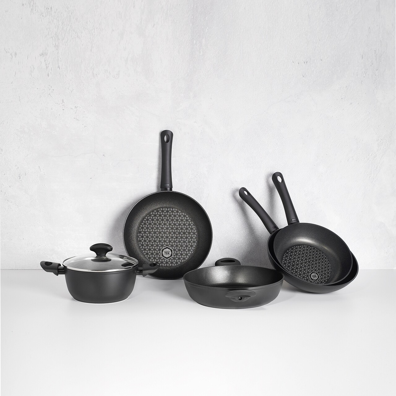 Linia Diamante Induction de la TVS cuprinde o gama larga de cratite si tigai din aluminiu cu sase straturi antiaderente, patru din aceste straturi sunt intarite cu particule minerale Diamantek Pro, ce ofera produselor o rezistenta foarte ridicata, facandu-le sigure si versatile. Manerele ergonomice sunt dotate cu senzor termic ce isi schimba culoarea in verde in momentul in care produsul atinge temperatura potrivita pentru gatit.