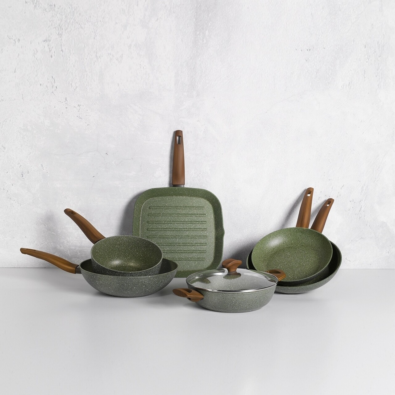 Tigaia din aluminiu cu 6 straturi antiaderente, 5 din aceste straturi sunt intarite cu particule minerale, este super rezistenta, sigura si versatila, fiind perfecta pentru orice reteta. Cele 5 straturi antiaderente cu efect de piatra sunt realizate folosind glicerina din plante ce nu au suferit modificari genetice, astfel se creaza un efect antiaderent natural. Datorita tehnologiei de inductie caldura se distribuie uniform pe toata suprafata tigaii si o protejeaza impotriva socurilor termice, transformand gatitul intr-o experienta placuta. Manerul ergonomic, elegant, cu aspect de lemn, placut la atingere confera o manevrare usoara a tigaii. Poate fi spalata, in conditii de siguranta, in masina de spalat vase. Potrivita pentru toate sursele de caldura, inclusiv pentru inductiei. Tigaia nu contine nichel, metale grele sau PFOA, fiind sigura pentru sanatate. A nu se lasa la indemana copiilor.