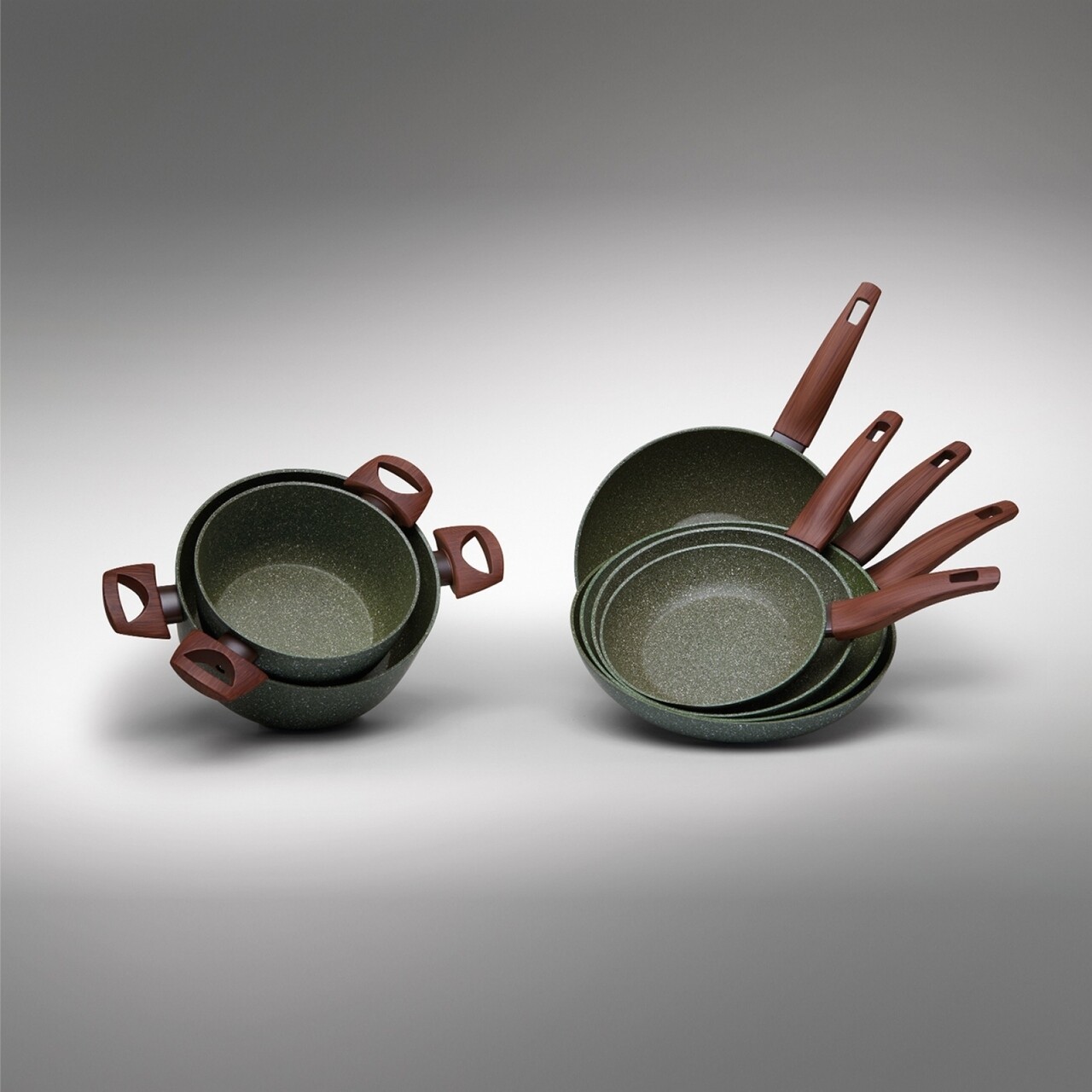 Linia Natura Induction de la TVS cuprinde o gama larga de cratite si tigai din aluminiu cu sase straturi antiaderente, cinci din aceste straturi sunt intarite cu particule minerale Vegetek, ce ofera produselor o rezistenta foarte ridicata, facandu-le sigure si versatile. Cele 5 straturi antiaderente cu efect de piatra sunt realizate folosind glicerina din plante ce nu au suferit modificari genetice, astfel se creaza un efect antiaderent natural. Manerele ergonomice, elegante, cu aspect de lemn, placute la atingere confera o manevrare usoara.