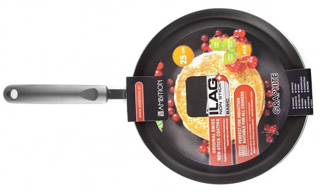 Clatitele sunt unul dintre acele feluri de mancare care, desi sunt usor de preparat, necesita uneltele potrivite pentru a atinge perfectiunea. Tigaia pentru clatite din aluminiu Graphite de la Ambition nu este doar o unealta, ci un adevarat aliat in bucataria oricarui iubitor al acestor delicatese. Fabricata din aluminiu, aceasta asigura o incalzire rapida si uniforma, ceea ce reprezinta cheia pentru clatite perfect subtiri si uniform gatite. Designul si functionalitatea sa unica fac din prajire o adevarata placere. Nu lasati ca prepararea clatitelor sa devina o provocare! In interiorul tigaii se afla invelisul original elvetian Ilag Basic care garanteaza proprietati antiaderente excelente. Datorita acestuia puteti fi siguri ca fiecare clatita se va intoarce fara efort si isi va pastra forma si culoarea perfecte. Acest strat este, de asemenea, rezistent la zgarieturi si la abraziune.
