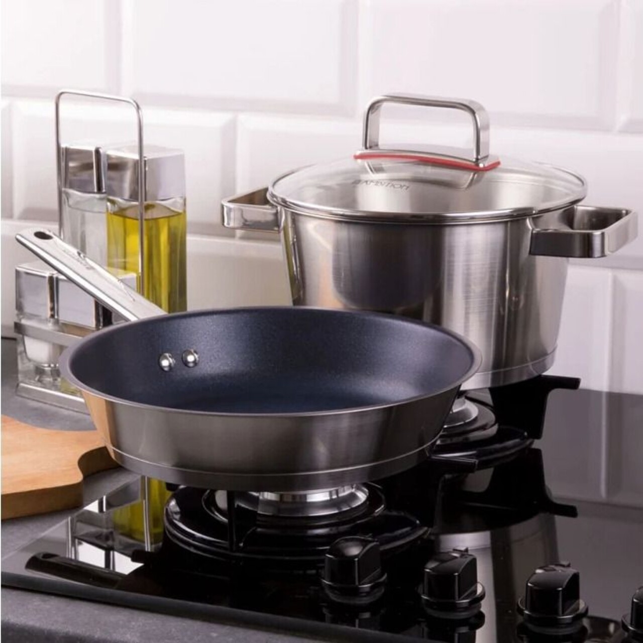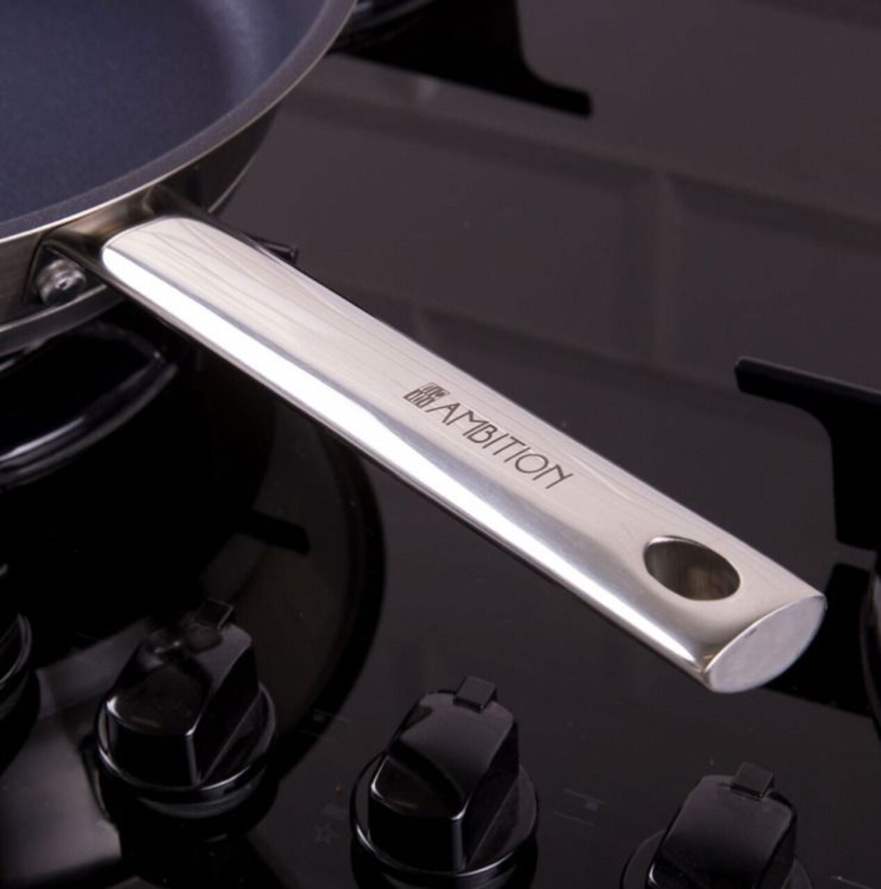 Vasele si tigaile din linia de selectie realizate de marca Ambition au fost concepute pentru a satisface cei mai pretentiosi clienti. Fabricat din otel inoxidabil de cea mai inalta calitate 18/10 (AISI 304). Acest tip de otel nu interactioneaza cu produsele alimentare, chiar si cu produsele acre. Este rezistent la acizii concentrati si la baze si la temperaturi ridicate. Laturile vaselor au o grosime de 0, 7 mm (in cazul unei tigai de 0, 6 mm grosime) ceea ce le permite sa mentina mancarea calda mai mult timp. Vasele de selectie au fundul cu trei straturi (otel - aluminiu - otel) care are o grosime de 5, 7 mm (in cazul unei tigai de 4, 1 mm grosime). Aceasta face ca, caldura acumulata la incalzire sa se raspandeasca uniform. Fundul multistrat permite si mentinerea temperaturii mai mult timp dupa gatire. Tigaile sunt patrate in interior cu un strat licentiat, de incredere si in siguranta in contact cu invelisul Teflon ™ Platinum Plus. Teflon ™ Platinum Plus este un invelis cu trei straturi cu o rezistenta crescuta la abraziune si zgarieturi. Garanteaza prajirea fara lipire. Navele de selectie sunt potrivite pentru toate tipurile de aragaz, inclusiv inductiv. De asemenea, pot fi utilizate in siguranta la cuptor pana la 180 ° C, astfel incat sunt perfecte nu numai pentru gatit, ci si pentru coacere.