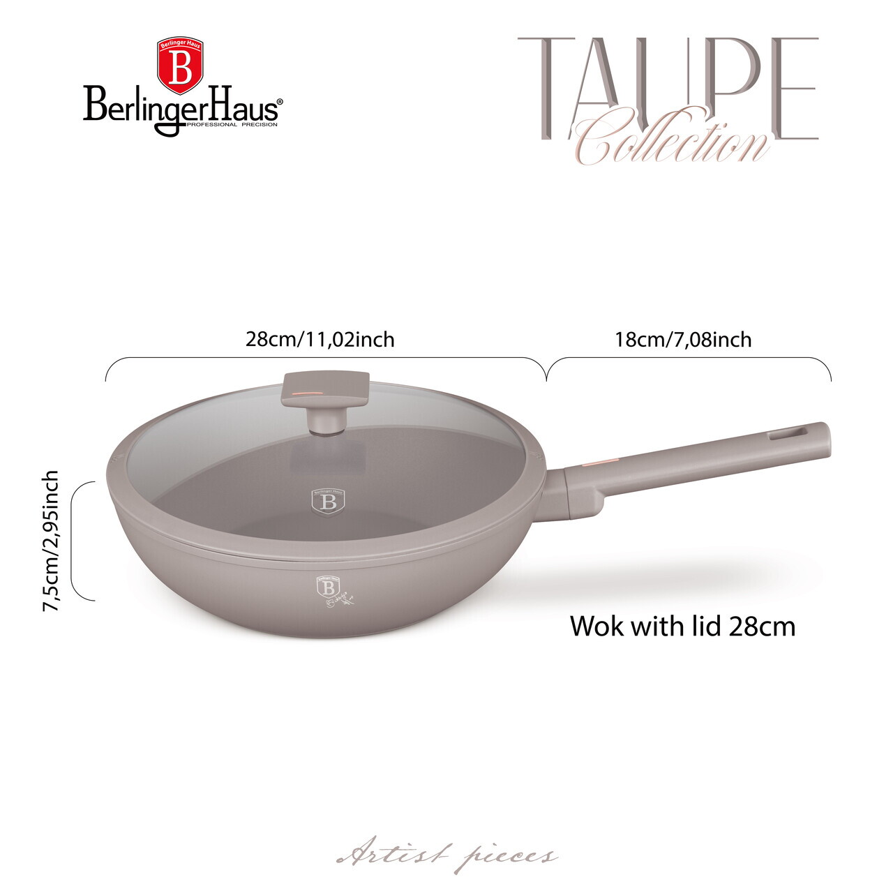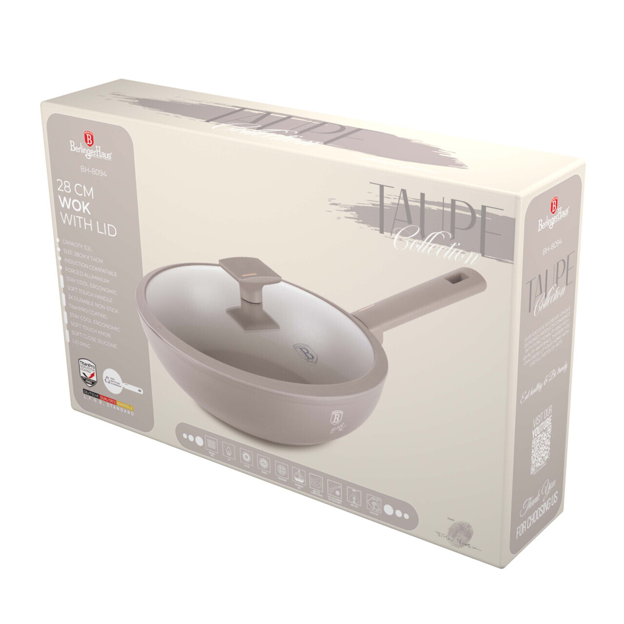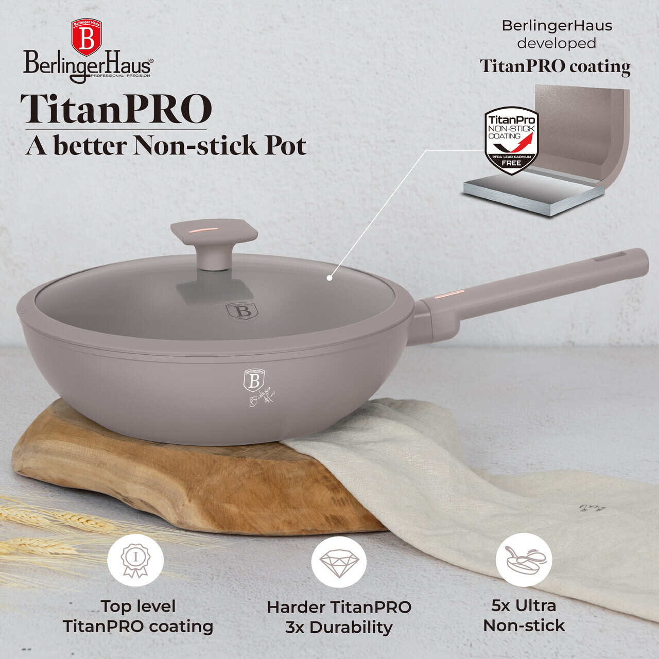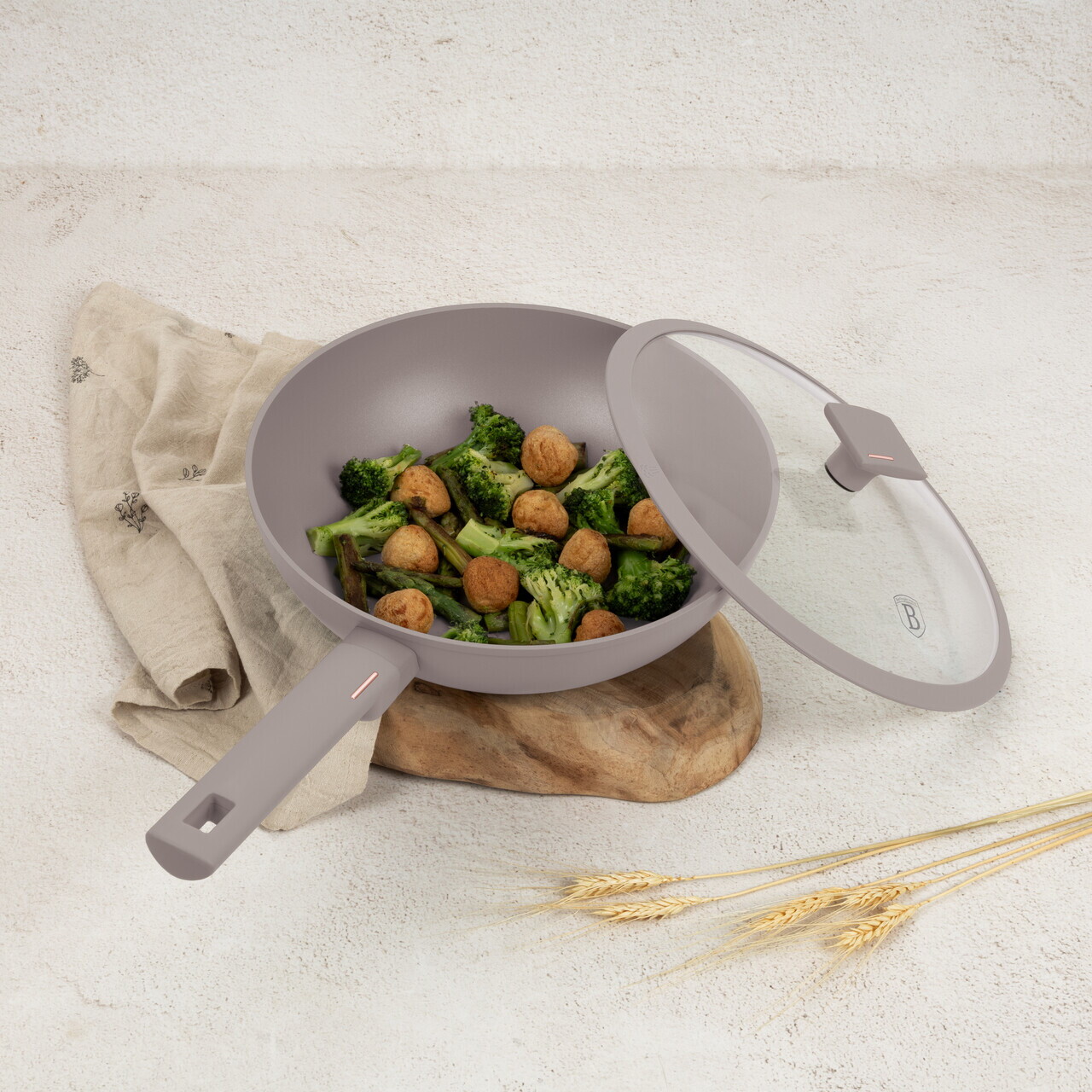 Tigaie Wok cu capac Berlinger Haus, Taupe, 28 cm, 3.2 L, aluminiu forjat, taupe mat
