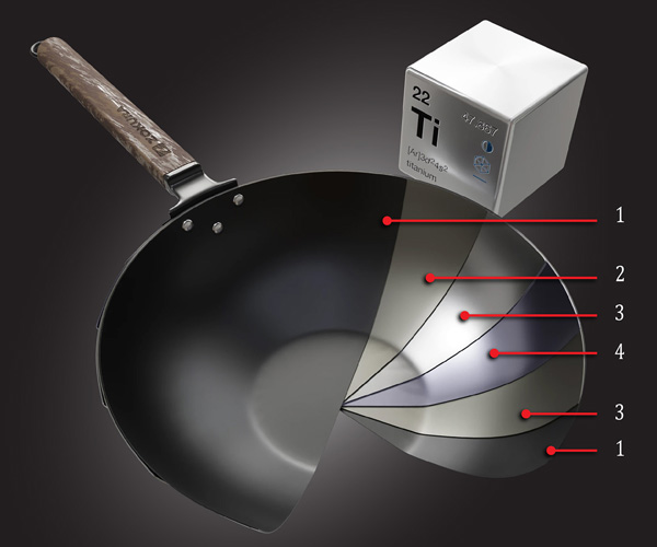 Acoperirea antiaderenta din TiN(Nitrura de titan) are rezistenta ridicata la coroziune si zgarieturi si este cea mai buna acoperire pentru tigaile wok din otel carbon. Cu toate acestea, Nu se recomanda curatarea in masina de spalat vase, Si se recomanda asezonarea periodica cu ulei vegetal.