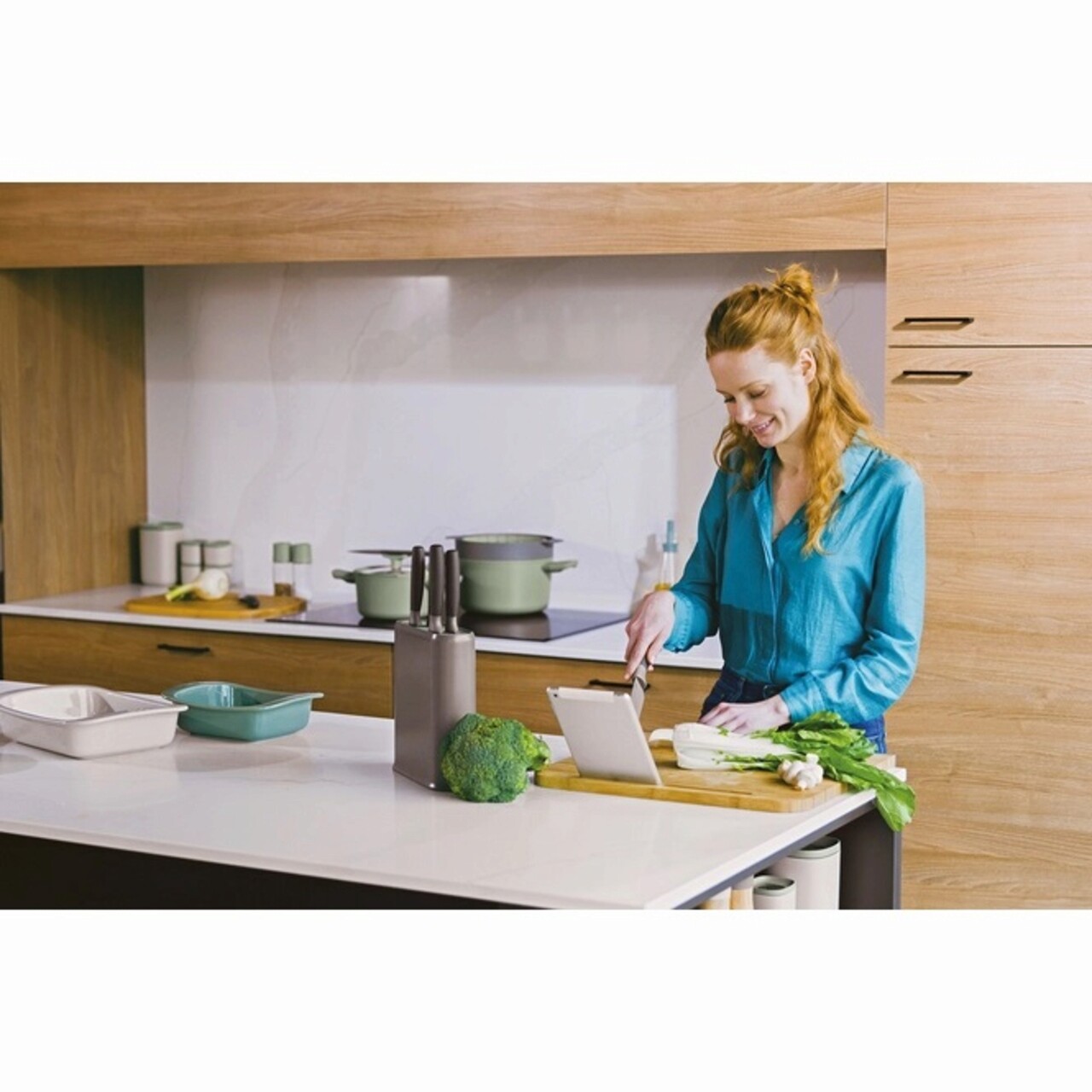 Tocatorul din bambus cu suport pentru tableta este o placa de taiat facuta pentru bucataria de astazi. Fie ca feliati o prajitura proaspat coapta, taiati legume pentru supa sau taiati in cubulete un piept de pui, eleganta placa de taiat Leo este alegerea perfecta pentru prepararea alimentelor. Tocatorul din bambus cu finisaj din ulei vegetal este rezistent si usor de curatat. Datorita suportului pentru tableta, urmarirea unei retete in timpul gatitului nu a fost niciodata atat de usoara!