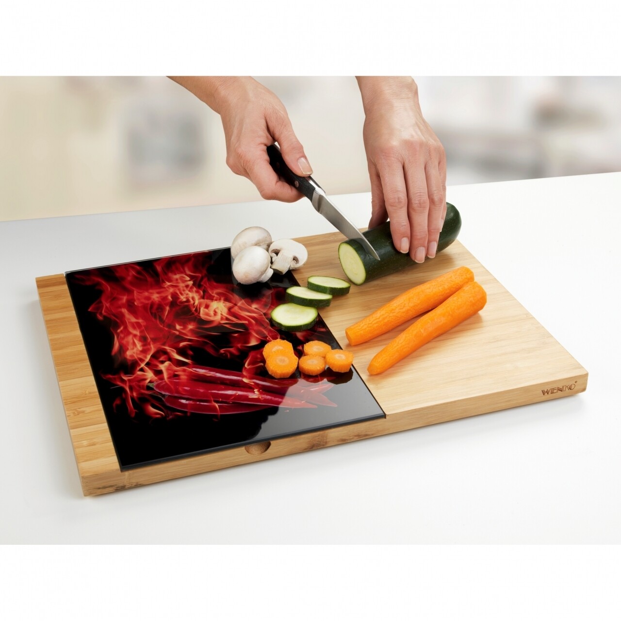 Tocator Flame, Wenko, 30 x 28 cm, lemn de bambus/sticla, natur/negru/rosu