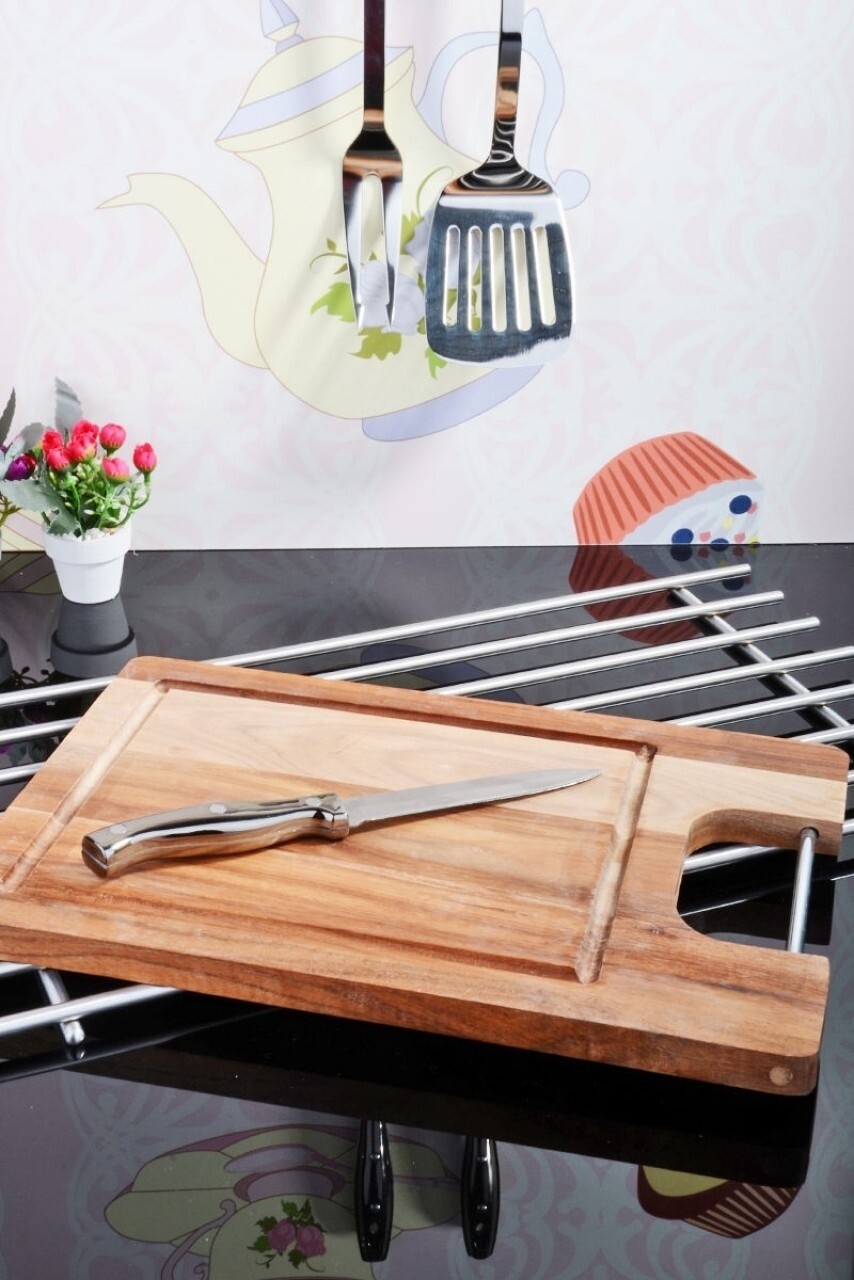 Tocator Kosova, Brown, cu maner din otel, lemn de salcam, 35 x 23 cm