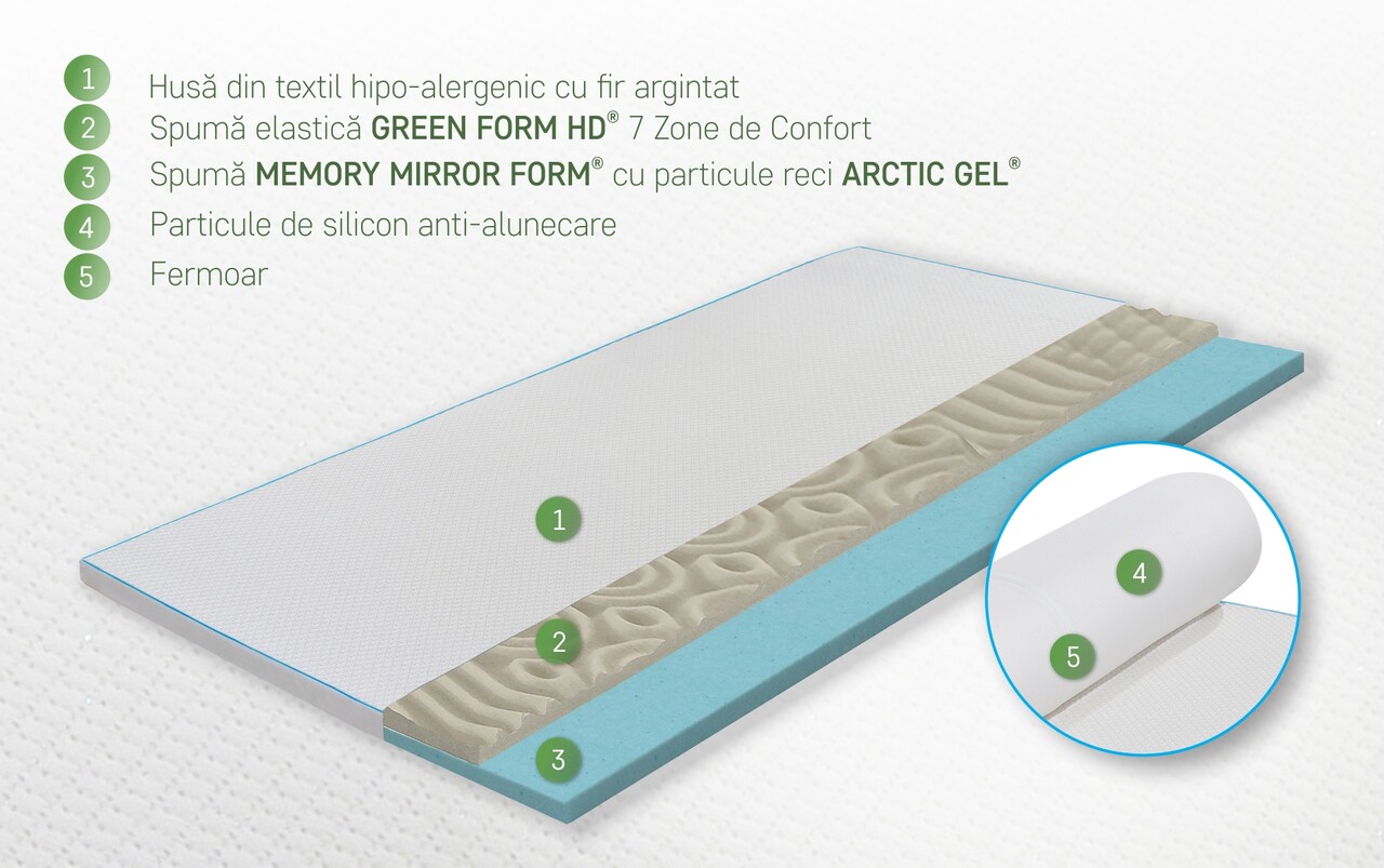 Structura topper-ului este formata din doua straturi de spuma poliuretanica: un strat din spuma elastica Green Form HD® cu celulatie deschisa si profilare 7 zone de confort si un strat de spuma Green Therm Memory cu particule reci Arctic Gel® care previn supraincalzirea in timpul somnului si se muleaza pe corp eliminand punctele de presiune in timpul somnului pentru a relaxa muschii si a asigura o circulatie a sangelui corespunzatoare. Husa se poate spala la 30 grade Celsius.