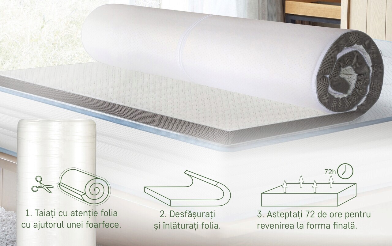 - desfaceti cu grija folia de protectie, fara a folosi cutitul sau alte obiecte taioase care ar putea deterioara tesatura topper-ului.