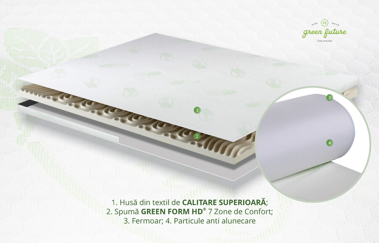 Topperul pentru saltea Fresh Mint a fost special creat pentru a imbunatati confortul saltelelor si a canapelelor folosite pentru dormit. Structura din spuma elastica Green Form HD® cu profilare 7 zone confera un strat de confort suplimentar pentru saltelele sau canapele foarte ferme si reduce disconfortul creat de imbinarile canapelei.
