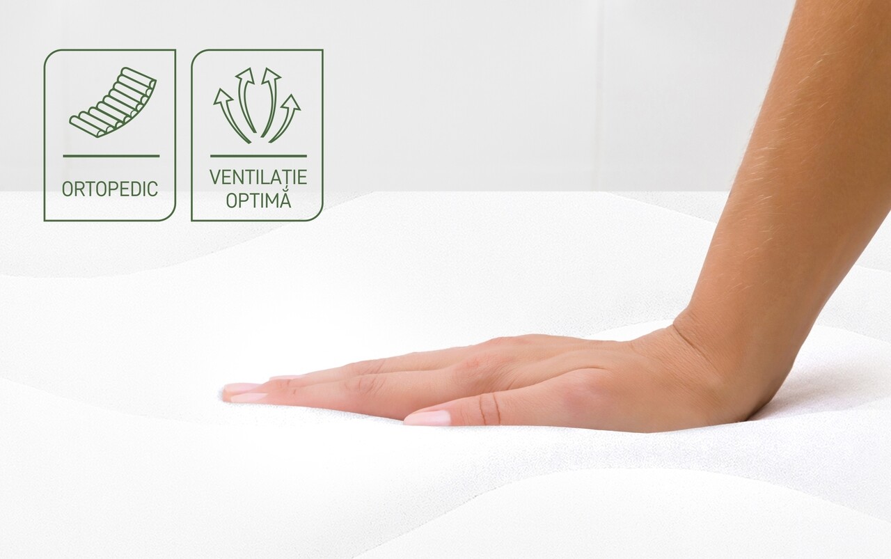 Structura din spuma poliuretanica elastica 7 zone de confort se muleaza pe corp oferind un strat de confort suplimentar pentru saltelele foarte ferme, sau reduce disconfortul creat de imbinarile canapelei si amelioreaza durerile de spate.