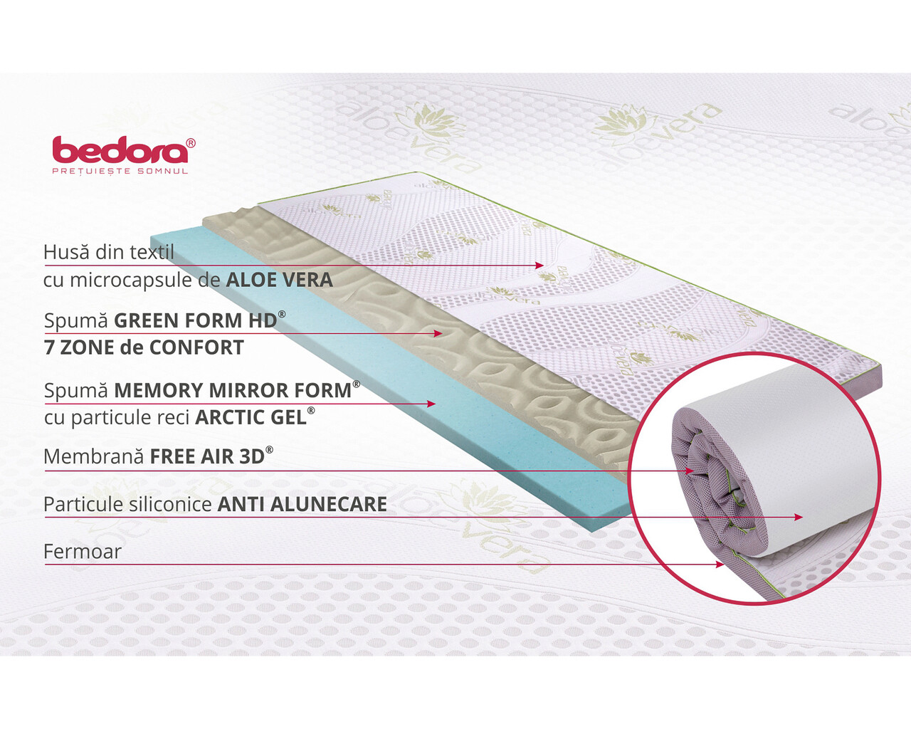 Topperul pentru saltea Bedora Viena Aloe Vera Cool Gel cu memory Arctic Gel® a fost special creat pentru a imbunatati confortul saltelelor si a canapelelor folosite pentru dormit. Structura din spuma elastica Green Form HD® si Green Therm Memory cu particule reci Arctic Gel® confera un strat de confort suplimentar pentru saltelele sau canapele foarte ferme si reduce disconfortul creat de imbinarile canapelei. Utilizarea lui poate elimina durerile de spate si imbunatati calitatea somnului dumneavoastra, dar poate si prelungi durata de viata a saltelei sau canapelei.